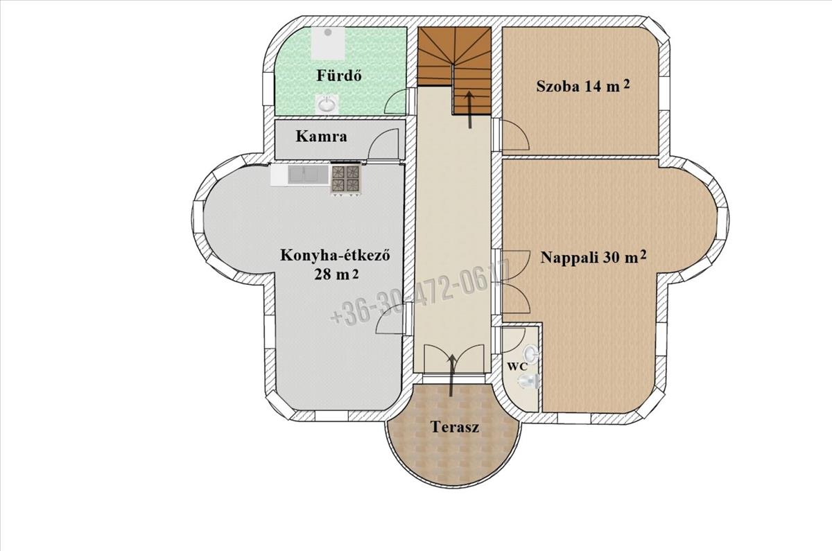 ALSÓ szint: Fedett teraszról lépünk be a házba, ahol étkezős konyha kamrával, nappali (30 m2), 1 szoba (14 m2), zuhanyzós fürdőszoba, közlekedő és egy wc mosdóval van.