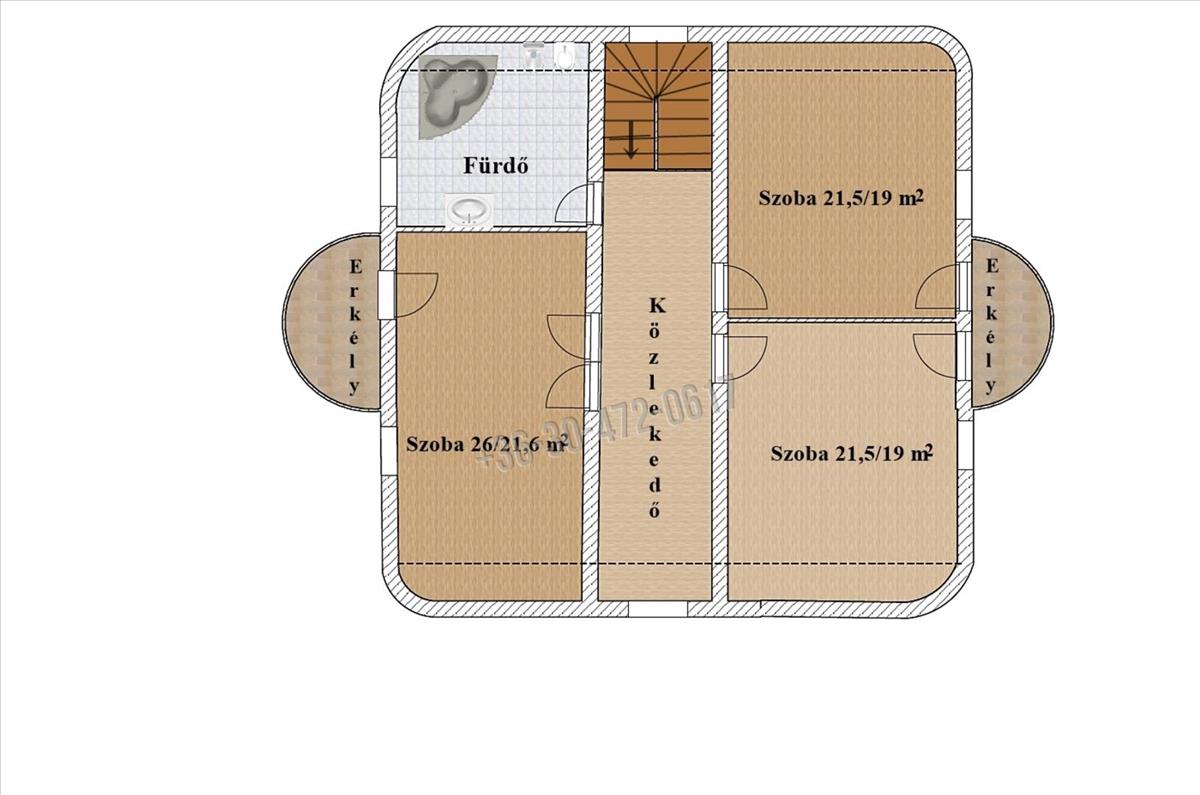 A felső SZINTre kényelmes, fából készült lépcső vezet. Itt 3 szobát, tágas fürdőszobát (sarokkád, wc) és egy közlekedőt alakítottak ki. Mindegyik szoba erkélykapcsolatos.