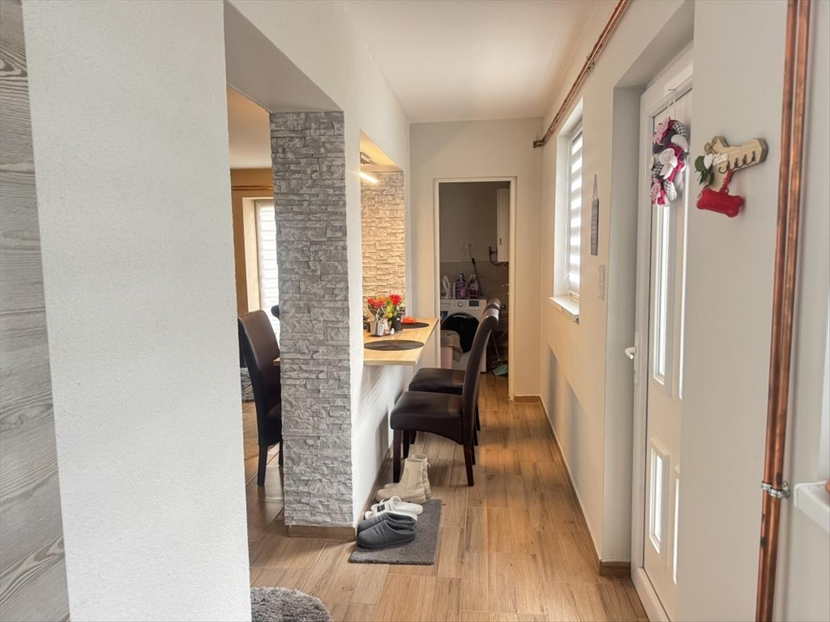 A ház helyiségei, ahogy belépünk az előszobába jobb kézre a tér kihasználása miatt egy átadóból alakítottak étkezőt, az amerikai konyhás nappaliból van egy kijárat a teraszra. Az előszobából egy félszoba nyílik, ami jelenleg gardrób, de kis baba/gyerek szoba is alakítható belőle. Valamint a nappaliból nyílik a nagy szoba és a fürdő is.
