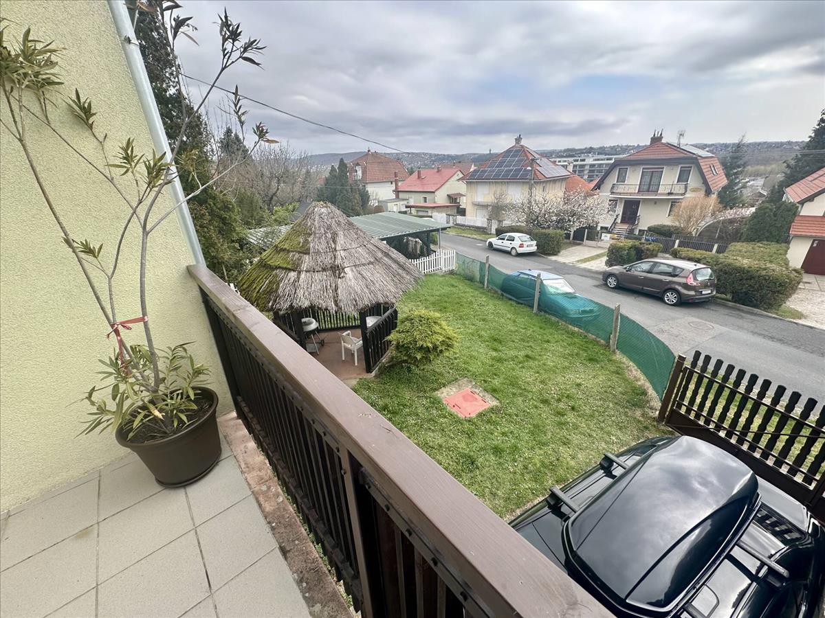 The upper level offers a comfortable living space with three spacious rooms, each featuring its own bathroom, ensuring privacy for every resident. The kitchen is well-separated and practically designed; the staircase to the attic also opens from here, offering additional storage space. The pleasantly sized balcony connected to the entryway is an ideal spot for a peaceful morning coffee or evening relaxation.