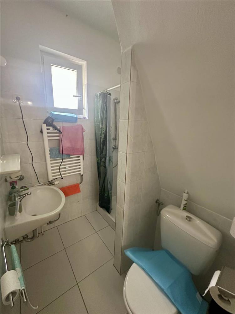 Im Obergeschoss eröffnet sich ein komfortabler Wohnbereich mit drei geräumigen Zimmern, die jeweils über ein eigenes Badezimmer verfügen, sodass die Privatsphäre für jeden Bewohner gewährleistet ist. Die Küche ist gut abgetrennt und praktisch gestaltet; von hier aus gelangt man auch zum Dachboden, der zusätzlichen Stauraum bietet. Der an den Flur angrenzende, angenehm große Balkon ist der ideale Ort für einen entspannten Morgenkaffee oder zur abendlichen Erholung.