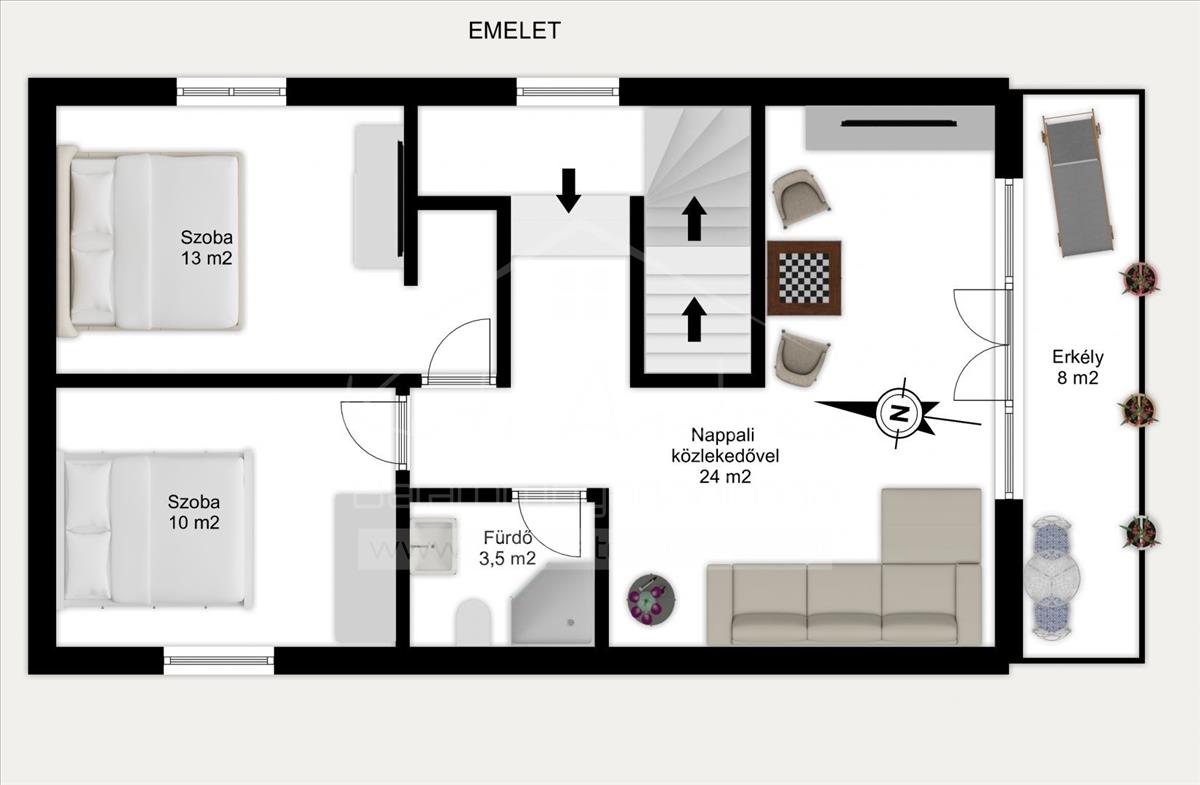 Az emeleten egy nappali jellegű közösségi tér, 2 külön nyíló hálószoba és egy tusolós fürdőszoba került kialakításra, így akár több generáció vagy vendégek fogadására is alkalmas lehet.