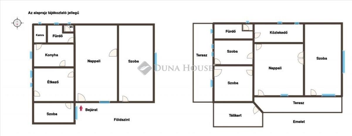 2 szinten: nappali + 5 szoba + étkező + 2 fürdő + 2 wc + télikert + teraszok