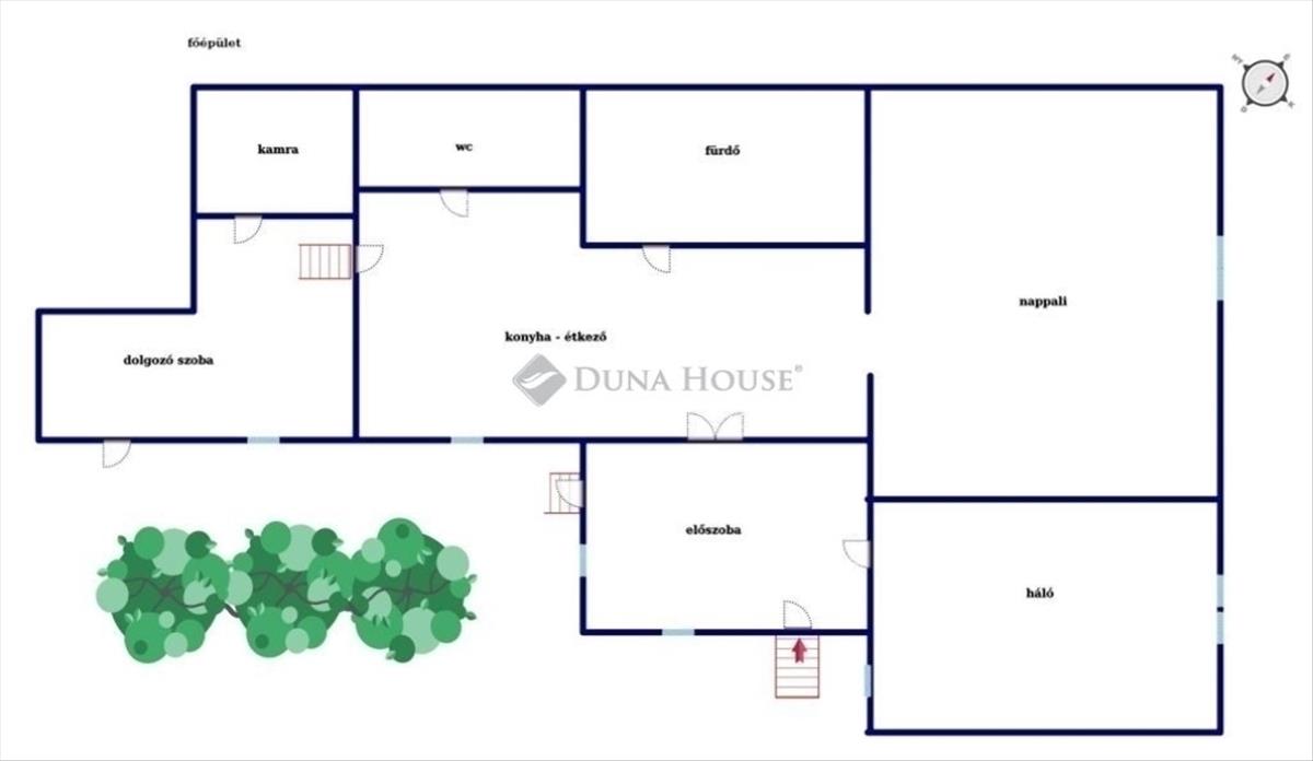 Elrendezés: nappali, háló, konyha-étkező, kamra, fürdő.