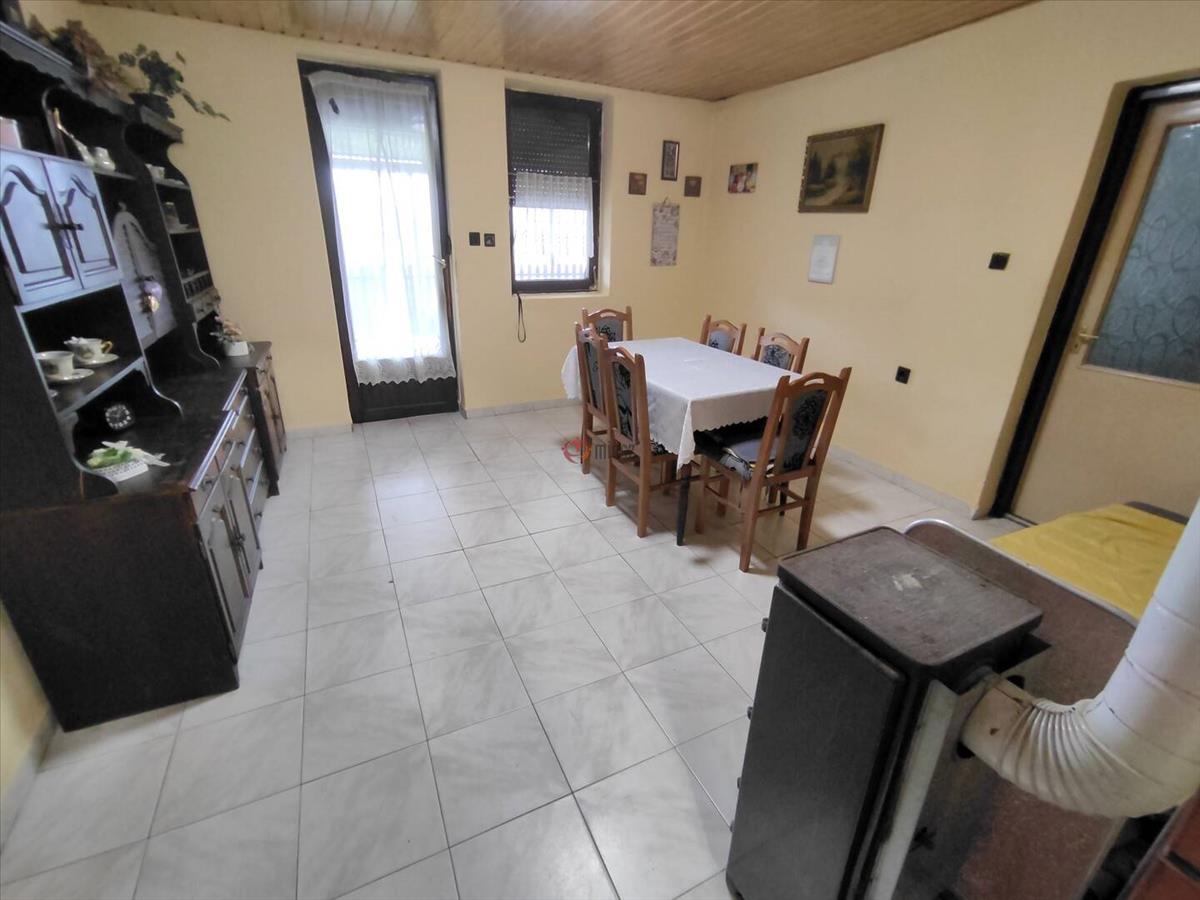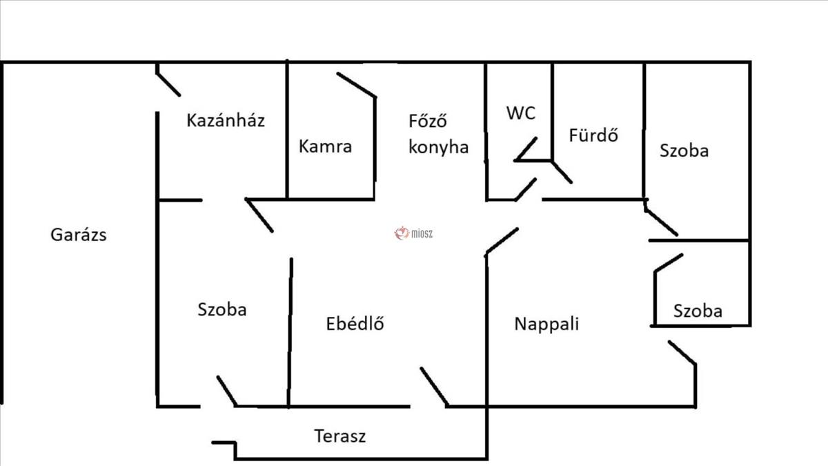 Helyiségek: előszoba, nappali, étkező, konyha, kamra, fürdő, wc, három hálószoba és kazánház.