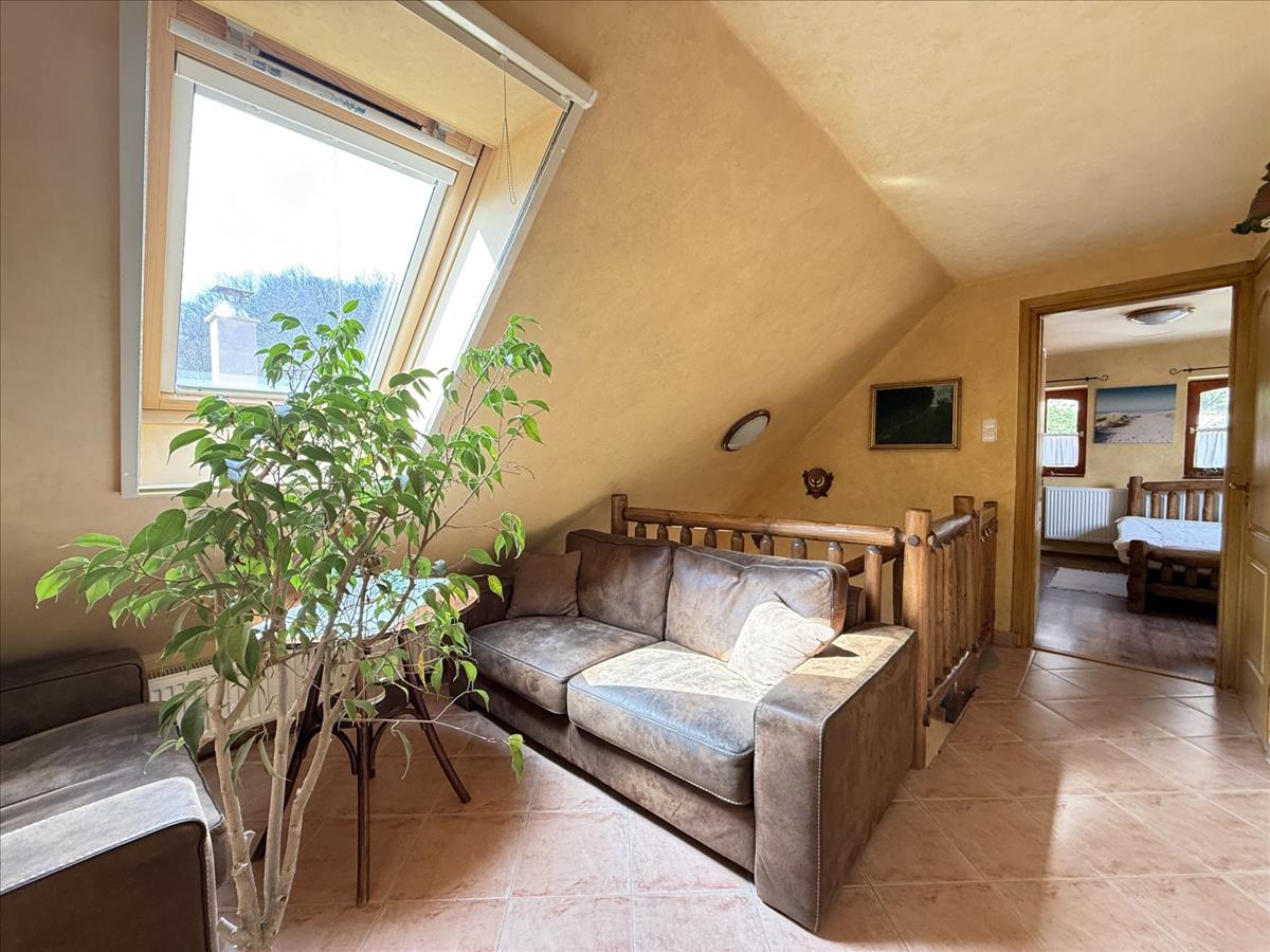 A felső szinten, a szint két legtávolabbi részén van két nagyobb háló, közöttük közösségi tér. Innen nyílik egy kisebb szoba, mely alkalmas lehet irodának, gardróbnak is, plusz a fürdő és a különálló wc is.