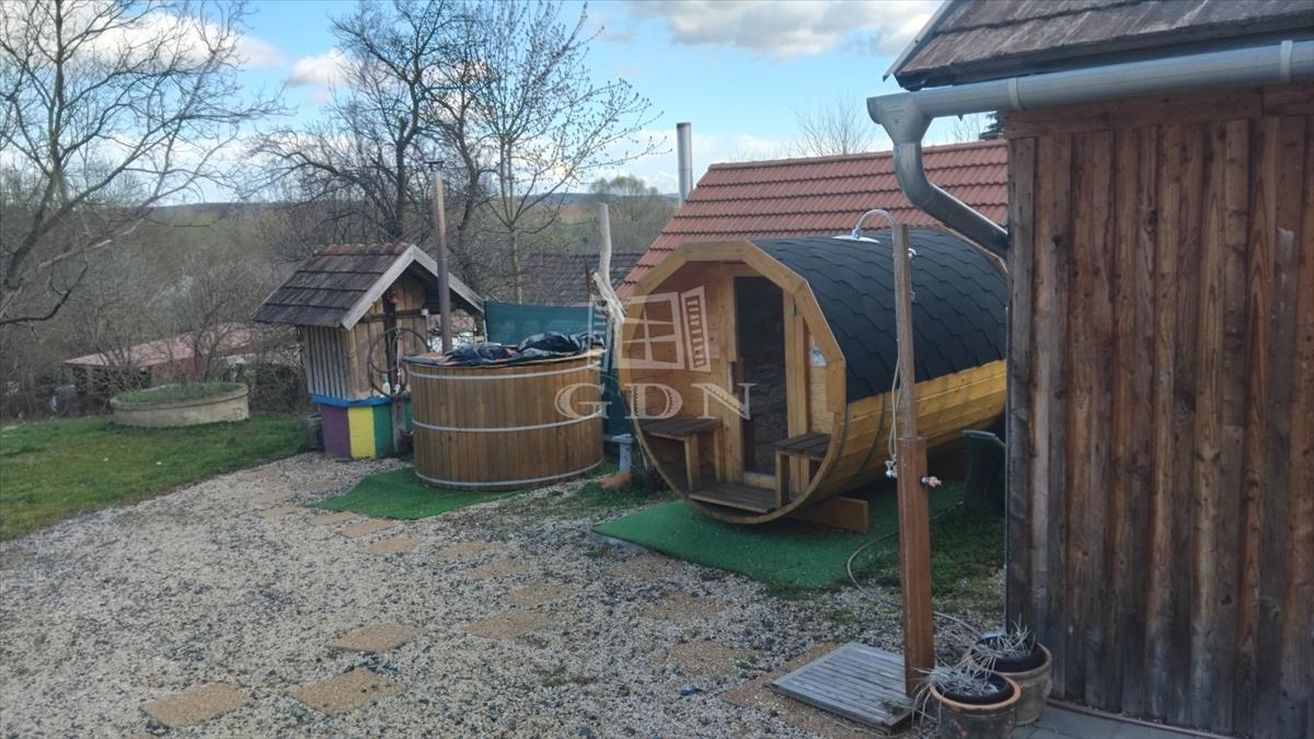 Az udvar kert felőli részén, szemben a fedett terasszal található egy fatüzelésű 6 személyes dézsafürdő, illetve egy 6 személyes hordó szauna.