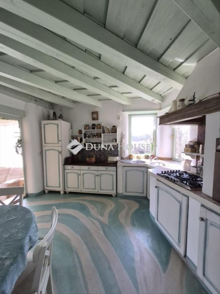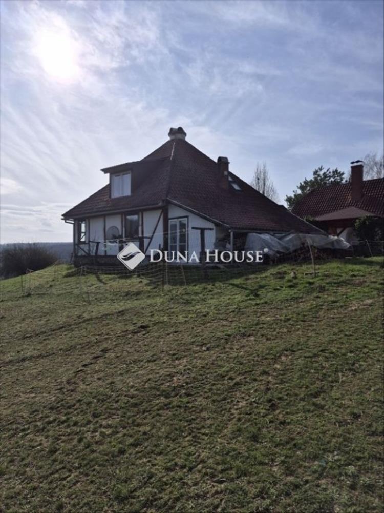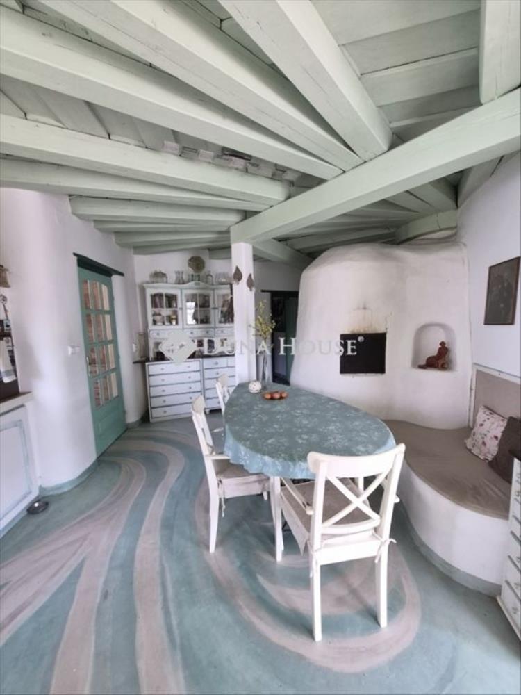 141 m²-es belső két szintes, különleges ötszögletű lakóház 4 szobával, konyhával, fürdőszobával, kamrával, télikert-nappalival és terasszal. a ház fűtése fatüzelésű kemencével és légfűtéssel biztosítja a meleget. a télikertből csodálatos kilátás nyílik a környező dombokra és völgyekre.
