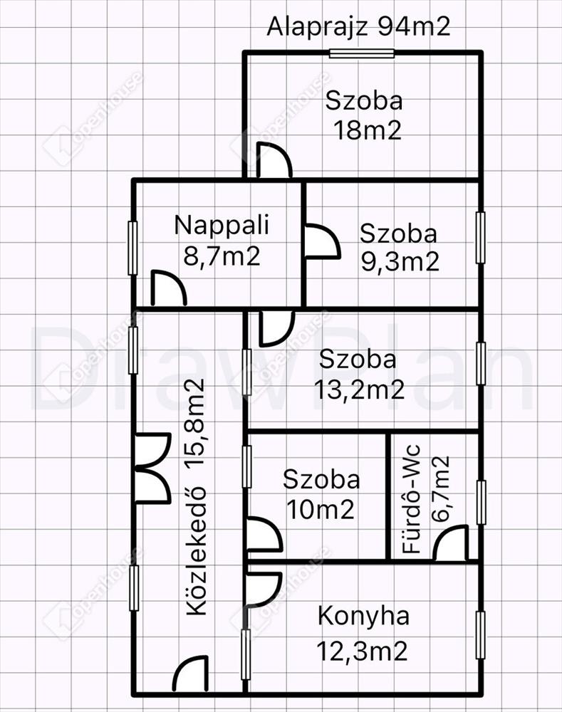 -Helyiségek 94m2 alapterületen: négy szoba, nappali, konyha, fürdő-wc, közlekedő.