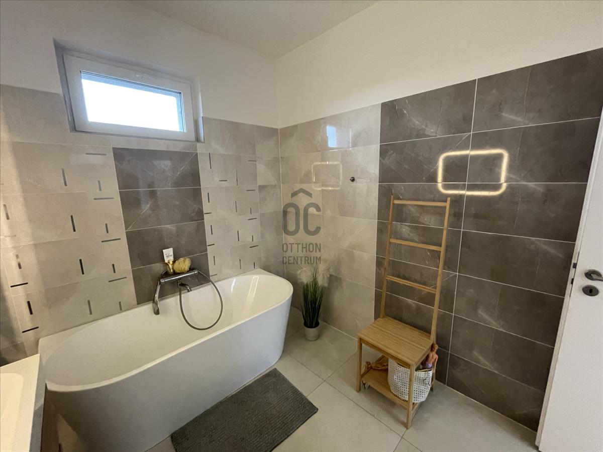 1 Szülői hálószoba saját fürdőszobával, szaunával és gardróbszobával, hangulatvilágítással és 3 szoba melyből 2 szobához saját gardróbszoba tartozik, fűthető dupla garázs, nappaliból nyíló hatalmas terasz (42 m2) melynek egy része fedett.