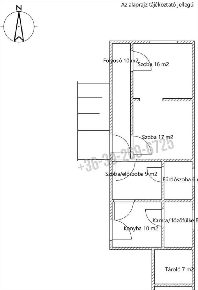 A Nyugati fekvésű házban a beépített folyosóról elől két világos nagyszoba nyílik, egy külön bejáratú félszobának használható helyiség, mögötte fürdőszoba, konyha és kamra található. Hozzáépítve van kb. 20 m2 tárolásra alkalmas mellékhelység.