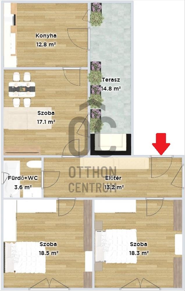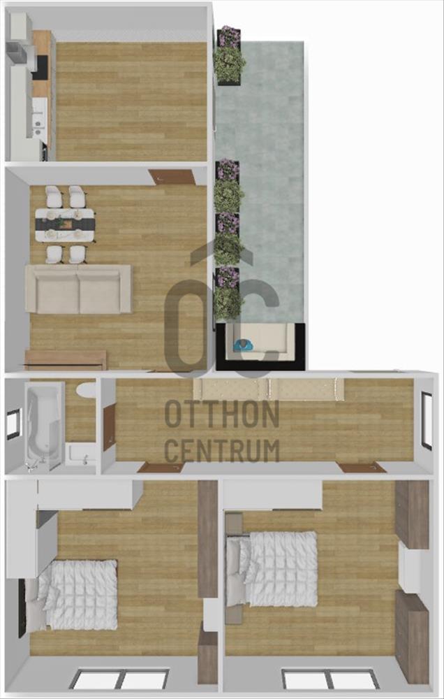 A három szobás elrendezés lehetőséget biztosít a családtagok számára, hogy kényelmesen éljenek, míg a 14 négyzetméteres terasz ideális helyszín a reggeli kávézásokhoz vagy a baráti összejövetelekhez.