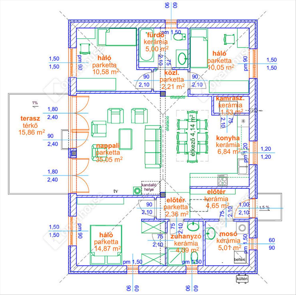 - Fűtőtestek: padlófűtés minden helyiségben a kamra kivételével