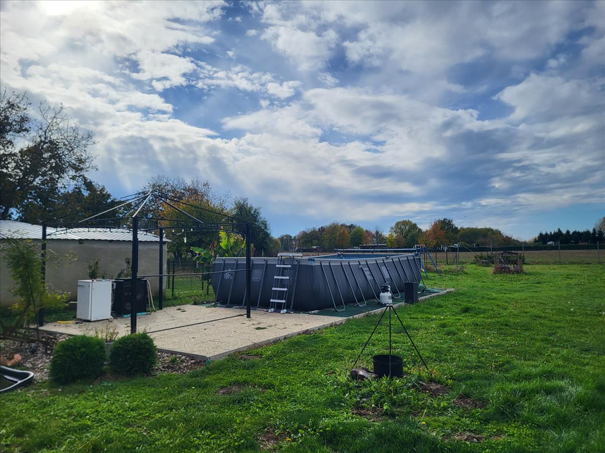 Az udvaron medence lett felállítva, betonozott aljzattal, kerti pavilonnal.