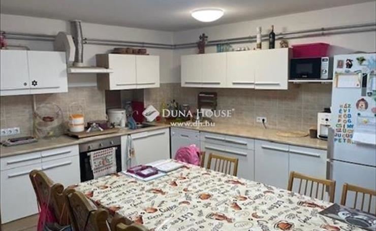 A nagyméretű konyha+étkezőben helyet foglal egy hatalmas méretű, egyedileg oda készített étkező asztal, amely a helység tartozéka. a ház további előnye, hogy a tető is le lett cserélve, így az új tulajdonosnak nem kell attól tartania, hogy ezzel a közeljövőben bármilyen gondja adódik. Az ingatlanhoz tartozik egy rendezett udvar is, amely nem csak zöld oázist nyújt a város zajától való elszakadásra, hanem praktikus elemei, mint a fás kamra és a garázs, is kiemelkedő értéket képviselnek. Itt bőven van hely a kerti eszközöknek, az autónak, és még a hobbi tevékenységeknek is.