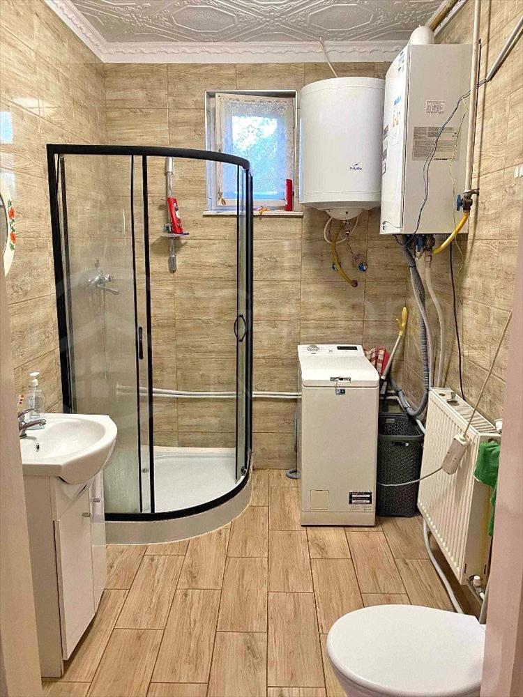 A külső szigetelés maradt el. a konyha, étkező nagyméretű járólappal ellátott, falaik festettek. a vízesblokk csempézett- zuhanykabin kialakítással.