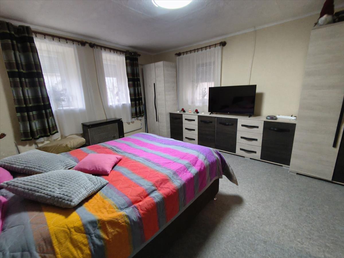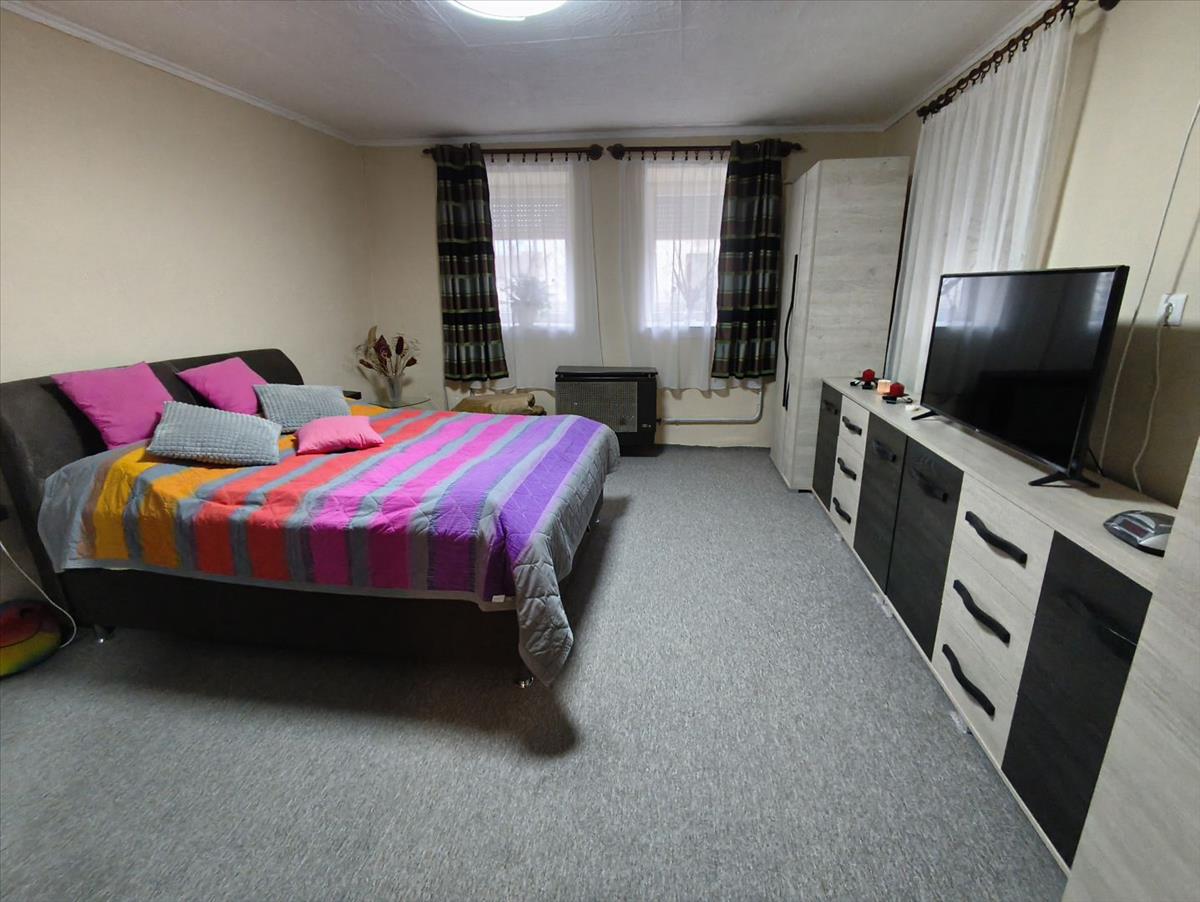 Bács-Kiskun Vármegye, Jánoshalmán 90 négyzetméteres (+ 32 négyzetméter egybeépített garázs) 2 szobás családi ház eladó. Az ingatlan jó állapotú. Építését tekintve vegyes építésű (tégla, vályog). Nyílászárói műanyagra cseréltek. Tetőszerkezete felújított. Villany és vízvezetékei cserélve lettek. Fűtése gázkonvektorral és fatüzelésű kályhával megoldott. Az ingatlan 1226 négyzetméteres telken fekszik. Központi riasztó rendszerrel és elektromos kapuval ellátott. Az ingatlanban jelenleg 2 szoba, egy 35 négyzetméteres ebédlő nappallival, nyári konyha, előszoba és fürdőszoba wc-vel található. a garázs egybeépített a lakórésszel, ezért alkalmas lehet még szoba kialakítására. a bútorok külön megegyezés szerint megvásárolhatóak a vételáron felül.