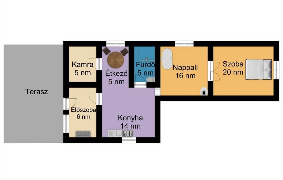 Belül jól átgondolt 2022. Évi fejlesztés eredményeként létrejött: egy hálószoba, egy nappali látványkáddal kandallókályhával, konyha konyhaszigettel és étkezővel, fürdőszoba zuhanyzóval nagy értékű szaniterekkel, kamra a gázcirkó kazánnal és egy előszoba. Összesen 71 m2 hasznos alapterületen. a beosztást lsd. a képek között közzétett alaprajz szerint.