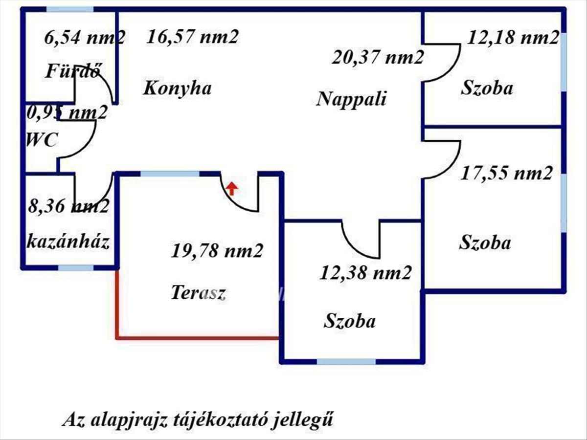 Az ingatlan elosztása: a fedett teraszról belépve amerikai konyhába érkezünk, amelyből 3 külön nyíló hálószoba és egy fürdőszoba, wc érhető el.
