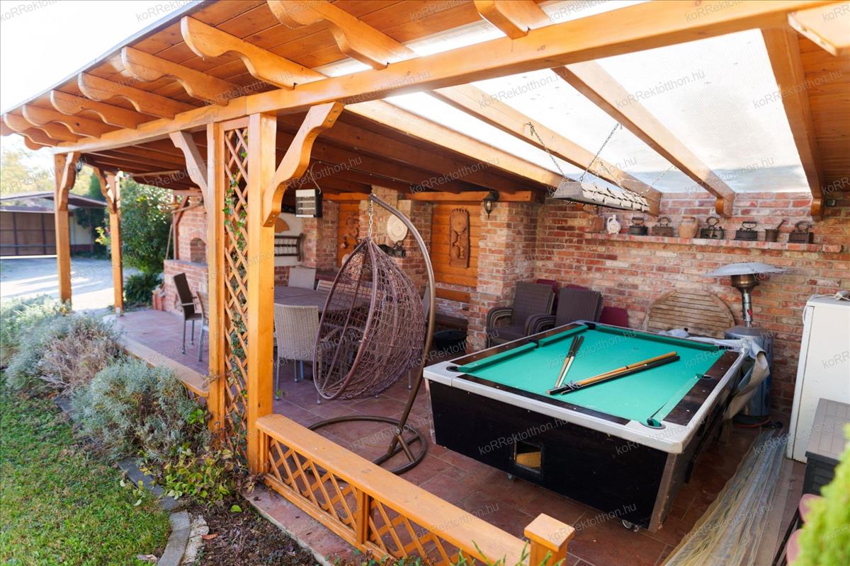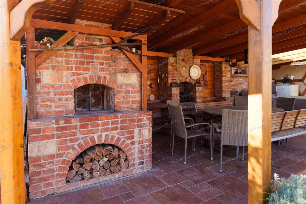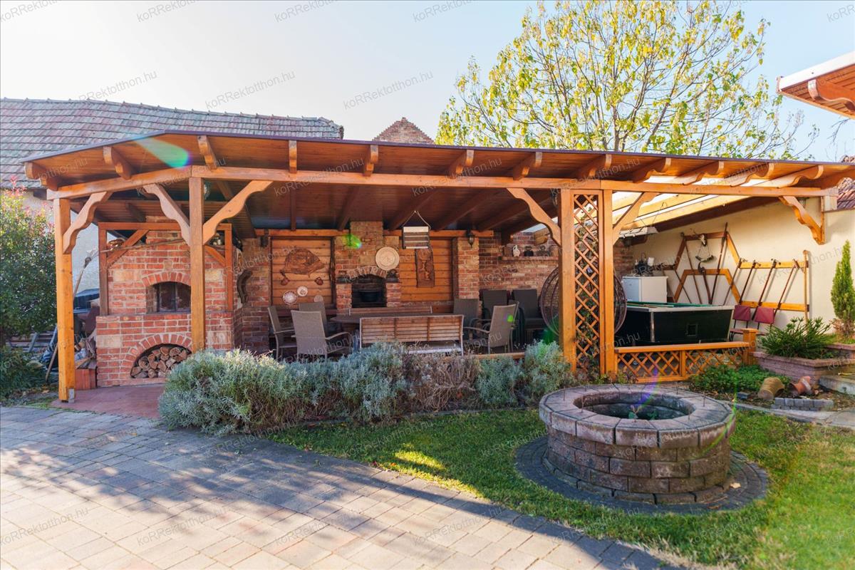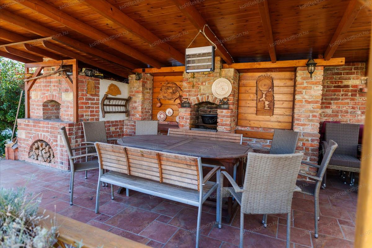 Emellett egy 38, 71 m²-es kerti filagória is rendelkezésre áll, kemencével, grillezővel, amely tökéletes pihenésre, kerti partikra.