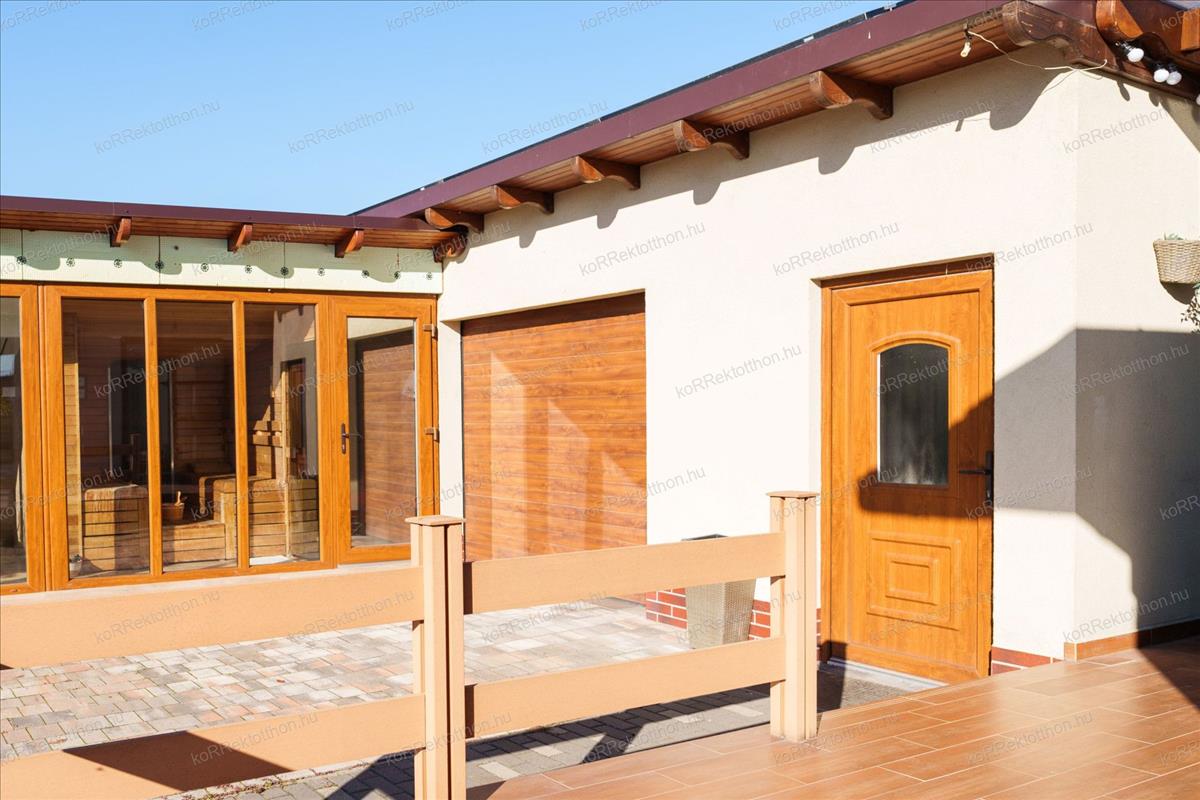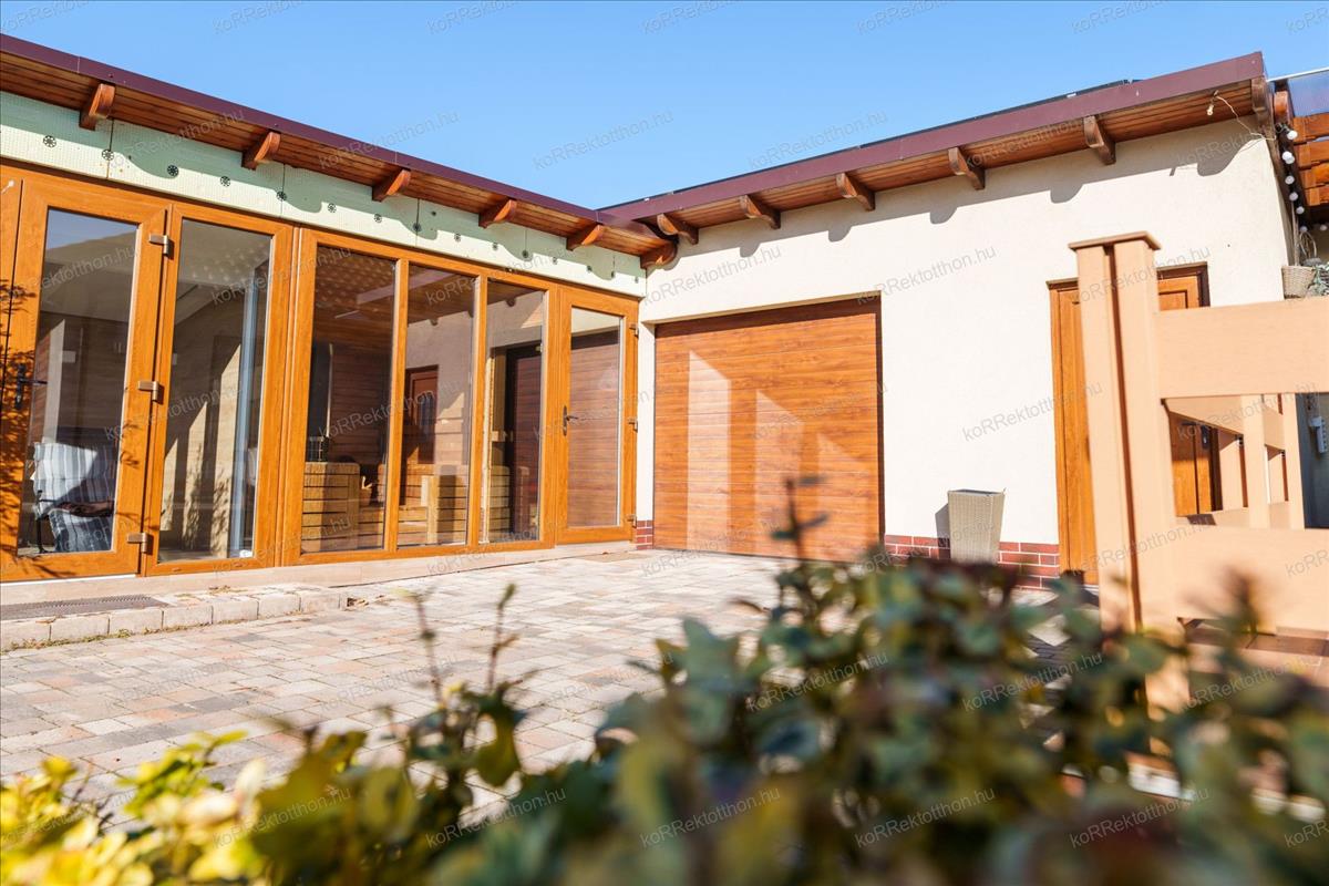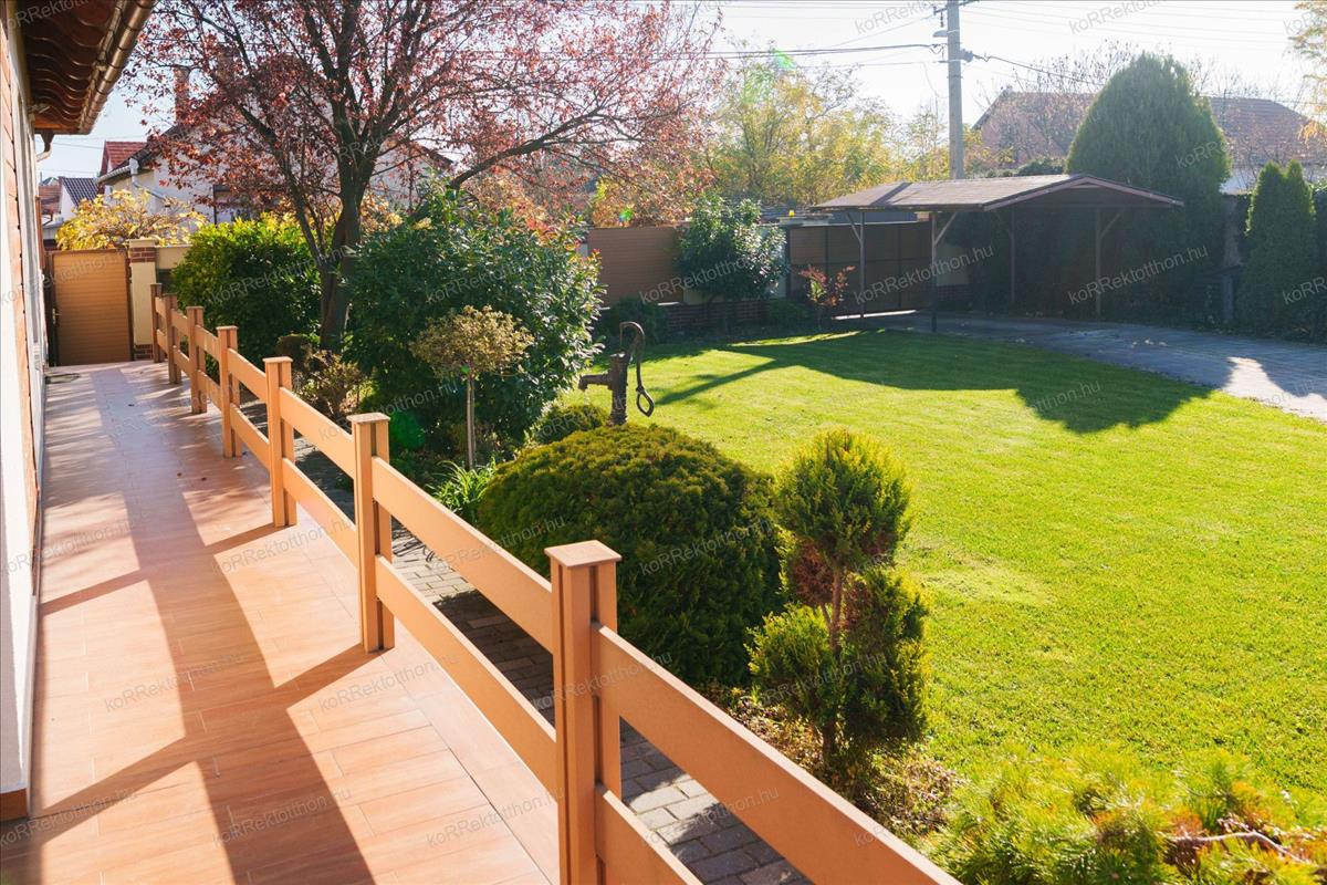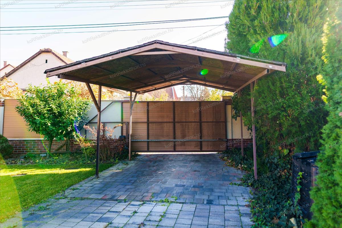 Az ingatlan teljesen körbekerített, esztétikus utcafronti kerítéssel, elektromos nagykapuval.
