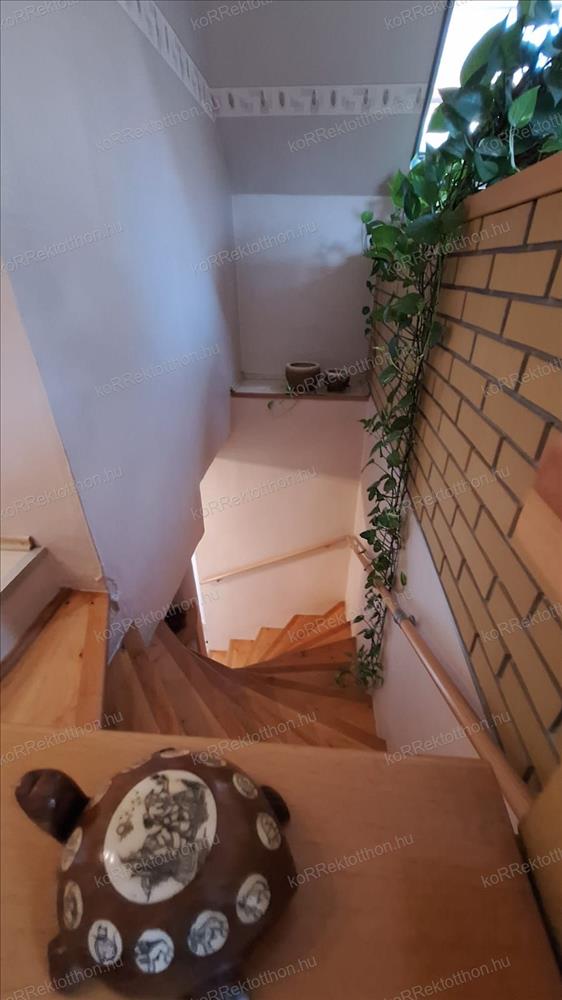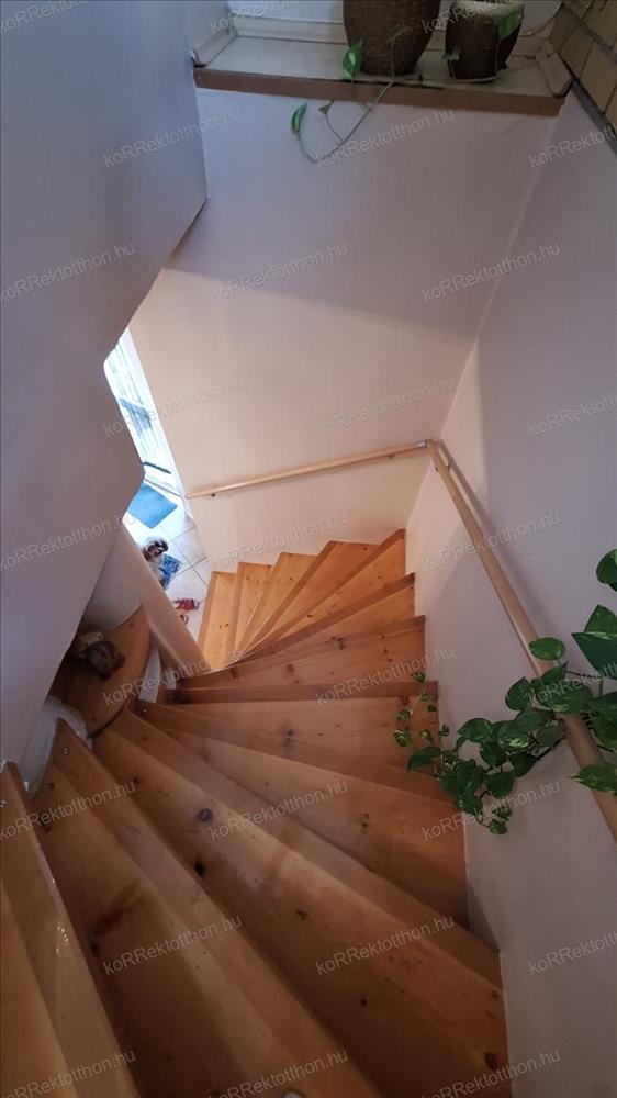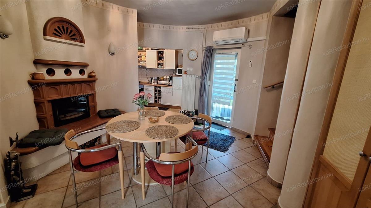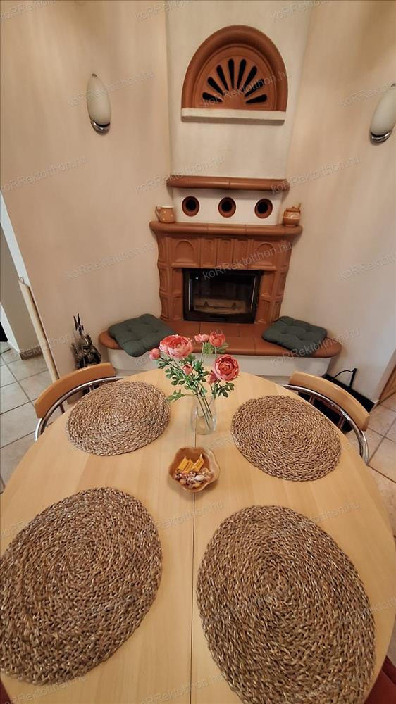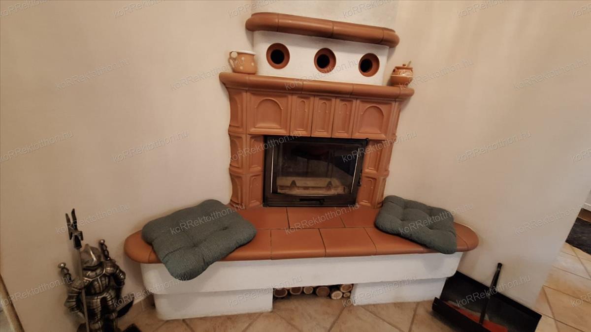 A földszinten tágas, napfényes nappali, étkező, mesés kandallóval, mely a ház ékköve, és az egyedien kialakított konyha található, valamint előszoba, külön mosdó és WC.