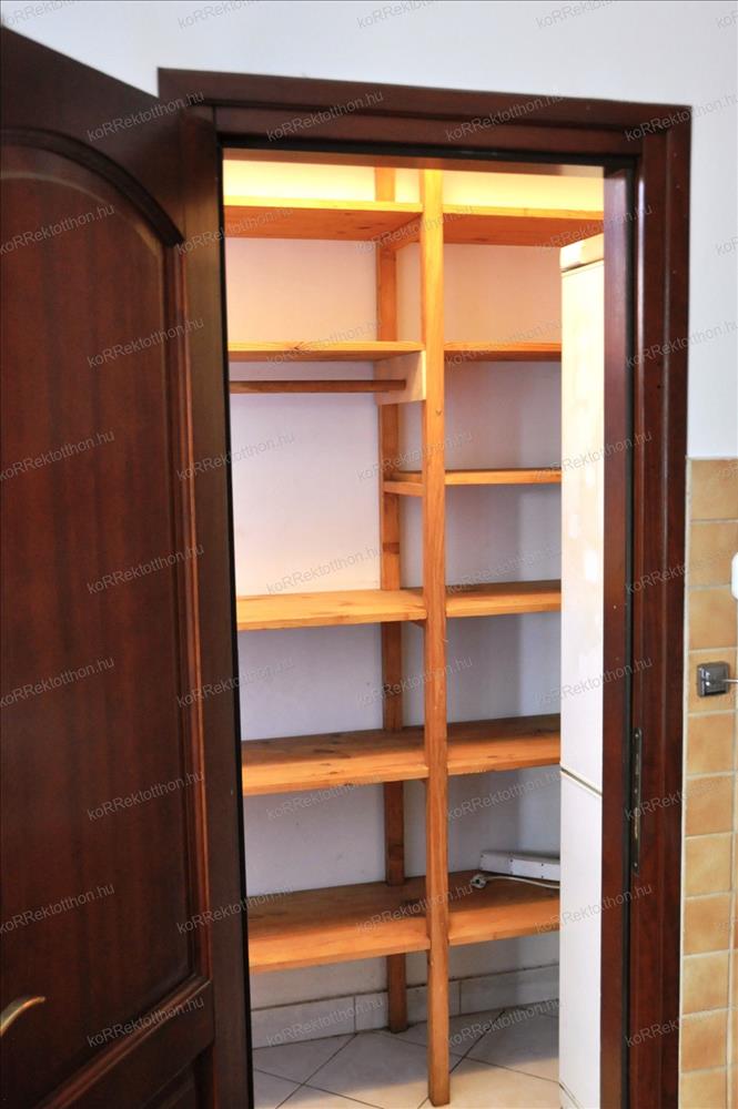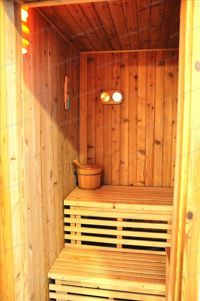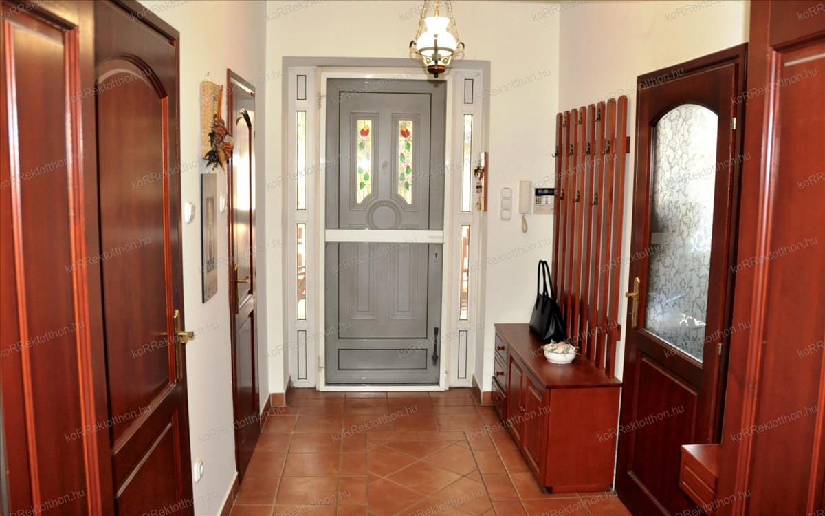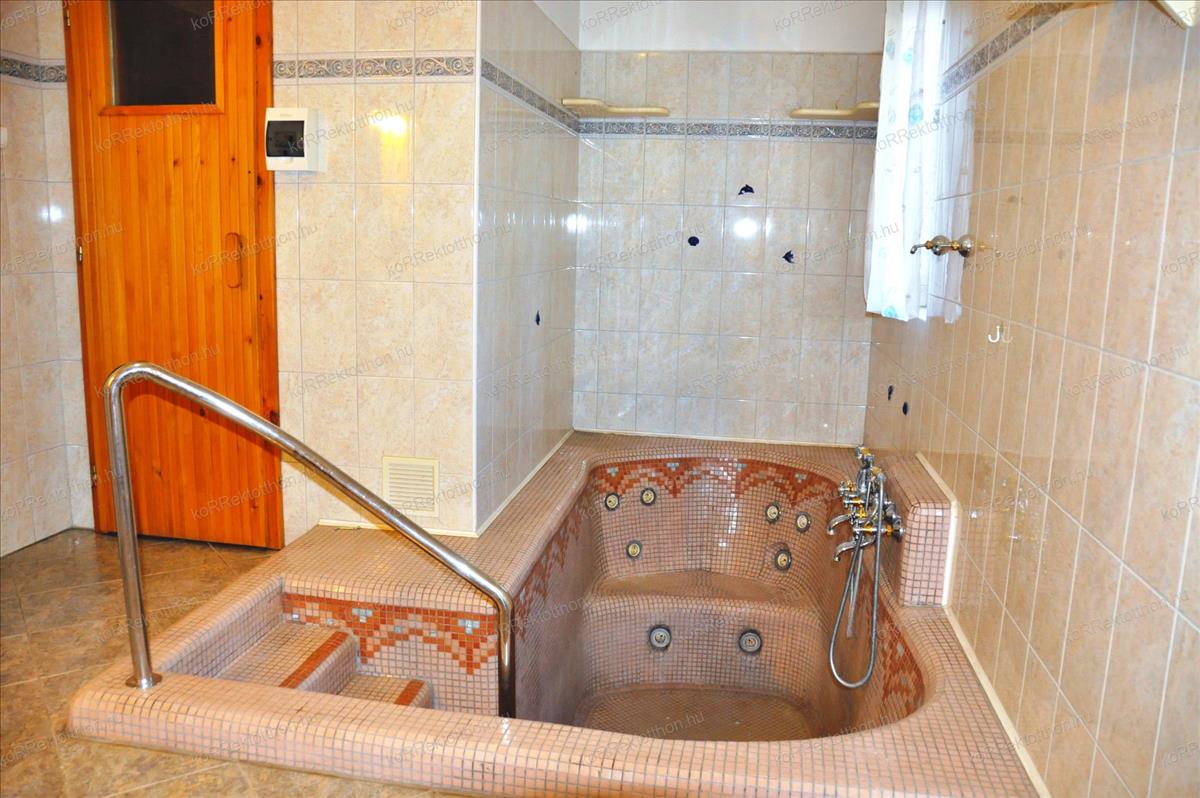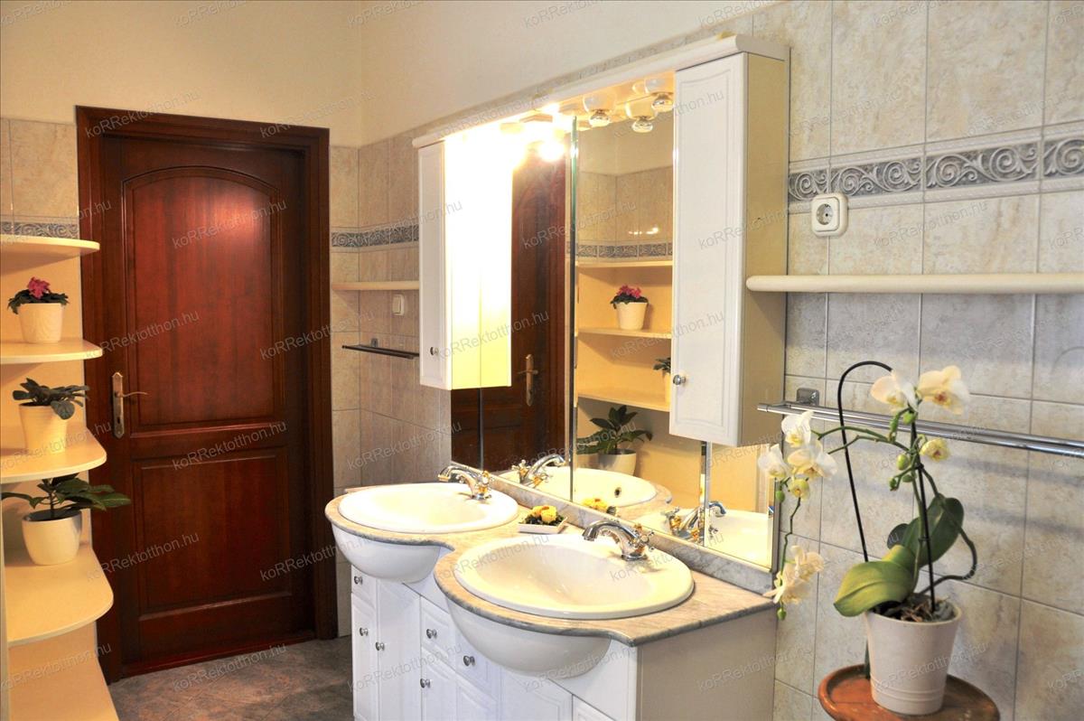 Az előszobából nyílik a konyha kamrával, egy hatalmas fürdőszoba medencével, szaunával, 2 személyes mosdóval, bidével, wc-vel, de a földszinten az előszobából nyíló kézmosós wc is megtalálható itt.