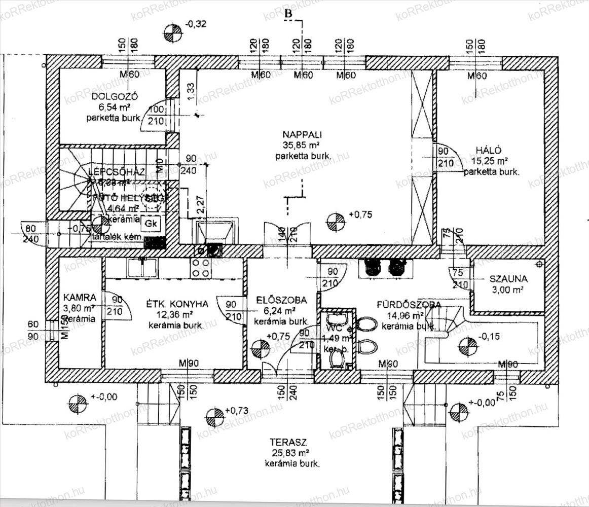 A melléképületében 2 állásos garázs van, amiben egy wc és egy kézmosó is helyet kapott, de innen nyílik a melléképületnek a fűtését biztosító gázkazános kazánház.