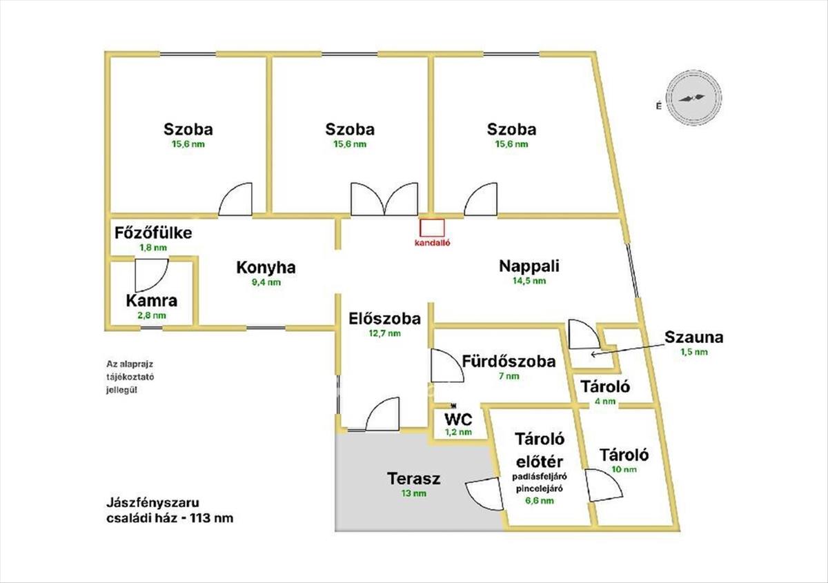 Az otthon tágas helyiségekkel és praktikus elrendezéssel rendelkezik: három külön nyíló szoba mellett nappali, konyha, kamra, fürdőszoba és külön wc szolgálja a család kényelmét. a ház különlegessége a hangulatos kandalló, amely a hidegebb hónapokban igazi otthonos légkört teremt, valamint a saját szauna, amely a mindennapokban is lehetőséget ad a pihenésre és feltöltődésre.