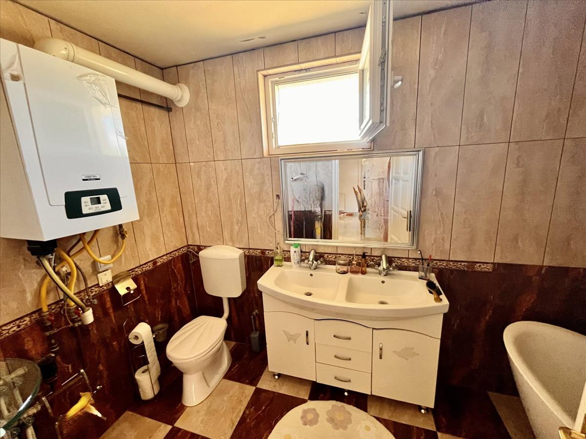 - **Fürdőszoba**: Márvány hatású hidegburkolatokkal.