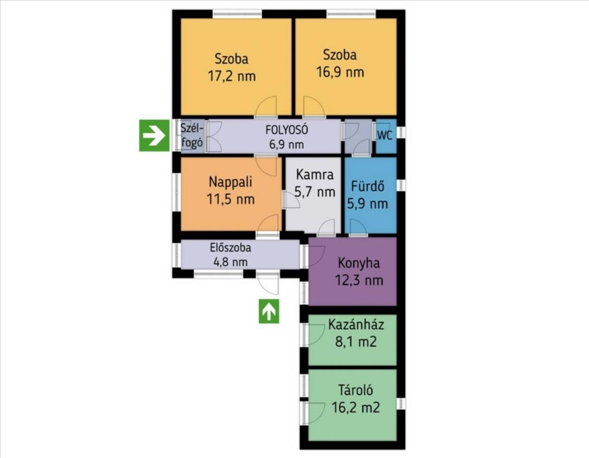 ⛺︎ 84 m2 belül (3 szoba, konyha, fürdő, külön wc, kamra, előszoba, folyosó, szélfogó)