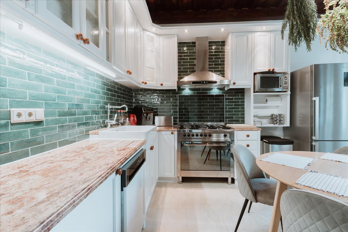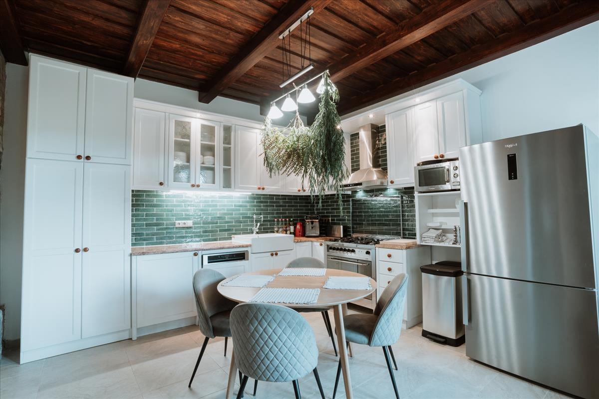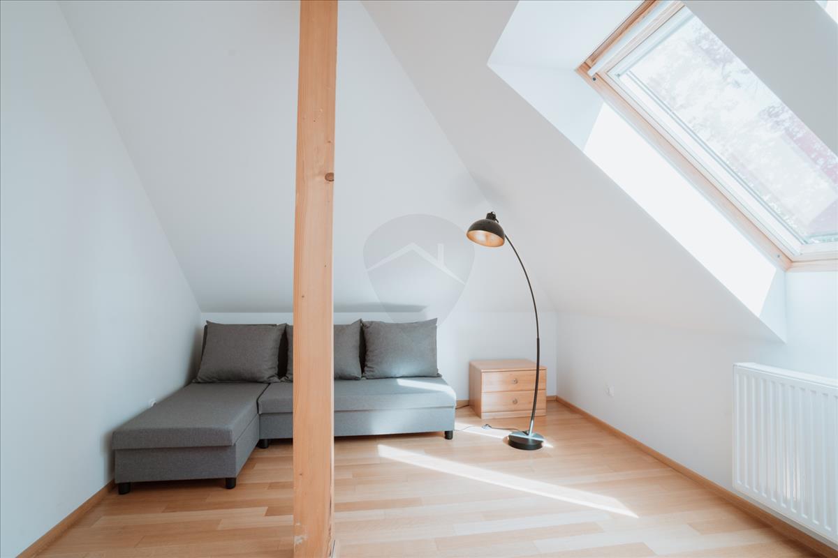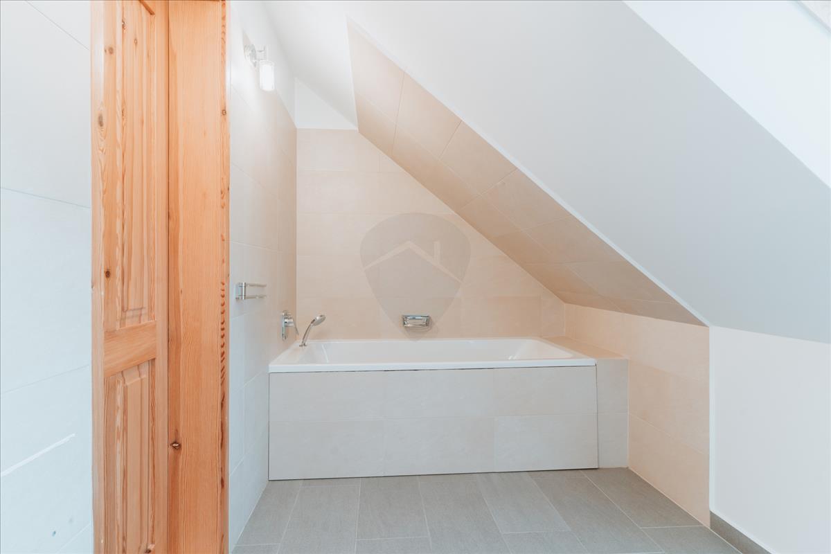 A ház két szintre oszlik, és mindkét emelet külön bejárattal rendelkezik. Az alsó szinten tágas hall, napfényes nappali, étkező, hálószoba gardróbbal, közlekedő folyosó, fürdőszoba és külön toalett található. a konyhát kamra is kiegészíti. Az alsó szint részben klimatizált, és a nappaliban egy eredeti cserépkályha ad melegséget. a fűtésről és melegvízről egy modern Ariston gázcirkó gondoskodik, amely az egész házban biztosítja a kellemes hőmérsékletet.