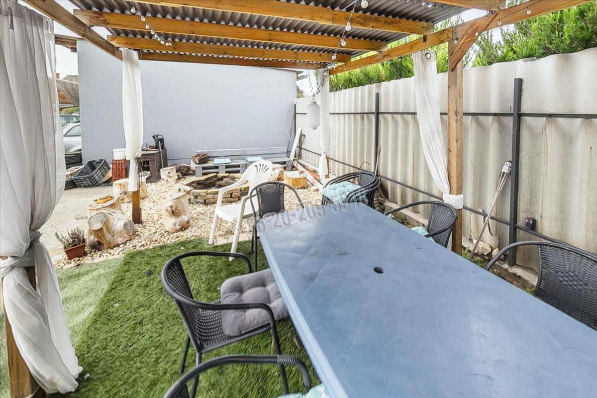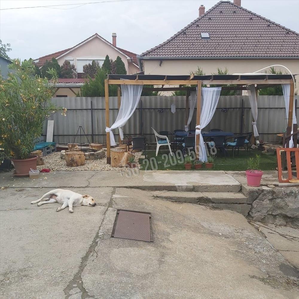 Az udvaron helyet kapott egy dupla állásos garázs és egy 15m2-es fedett kerti pavilon, grillező helyiség is. a telek részben betonozott, részben pedig parkosított.