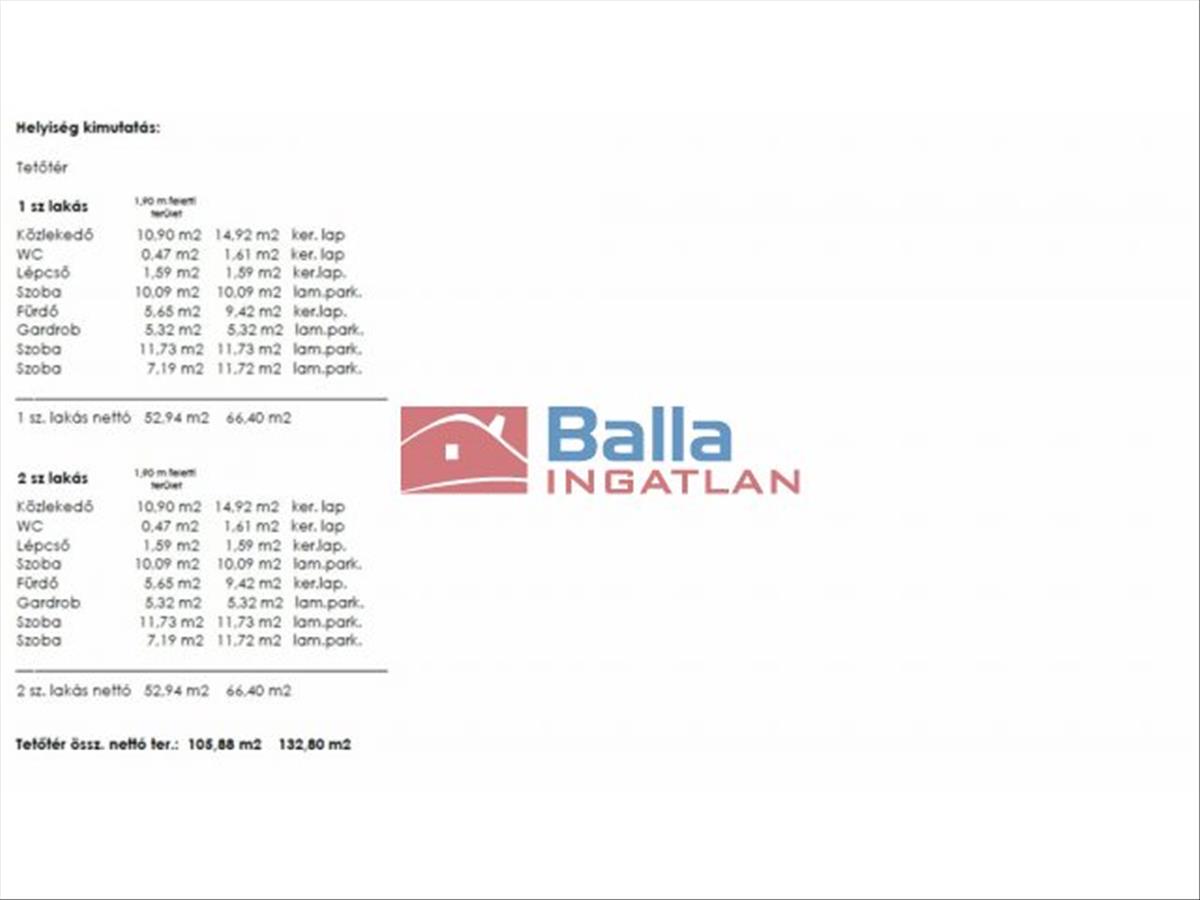 A 2 lakásos ház egy-egy lakása és kertje fizikailag és helyrajzi szám alapján is önálló, nincsenek közös használatú részek. a 2. Számú lakás földszintje 69, 29 nm , tetőtere netto 52, 94 nm területű. a földszinten nappali-étkező, amerikai konyha, 1 szoba, fürdőszoba+wc, kamra, háztartási helység található. a tetőtérben 3 szoba, gardrób, fürdő+wc, wc található. a földszinti terasz a hátsó kertre néz.