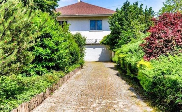 A kerti autó behajtó motorizált nyíló kertkapukkal rendelkezik, belül 3 autó számára burkolt autóparkoló.
