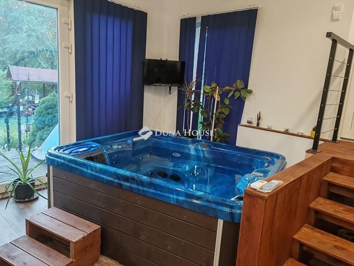 Különálló wellness épület szintén hatalmas ablakfelülettel, ledes, csillagos égbolttal rendelkezik. Beépítésre került egy különálló wc, egy esőztetős zuhanyzó, 4 személyes (bluetooth-os, két motoros) jakuzzi és egy infraszauna. Az épülethez közvetlen napozóterasz tartozik.