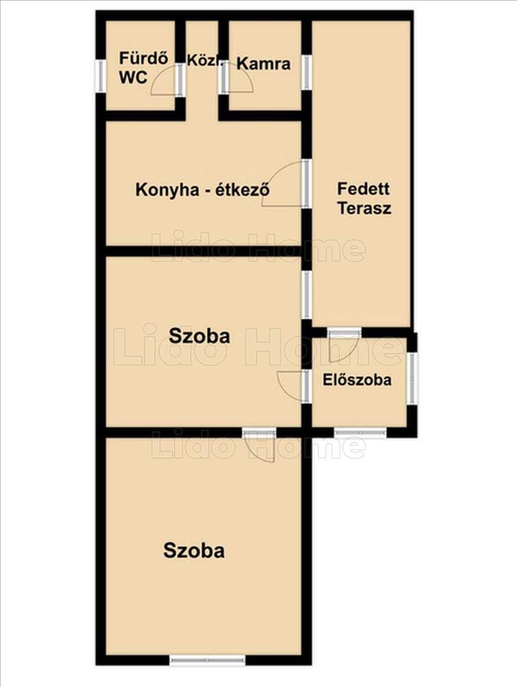 Hasznos alapterülete kb. 72 m2, benne előszoba, 2 lakószoba, konyha, kamra, fürdőszoba helyiségekkel.