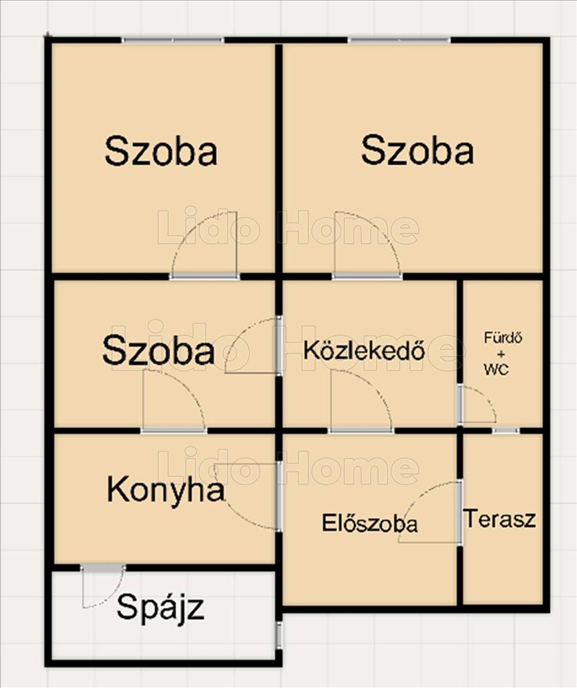 3 tágas szoba, közlekedő, előszoba, konyha, spájz, terasz.