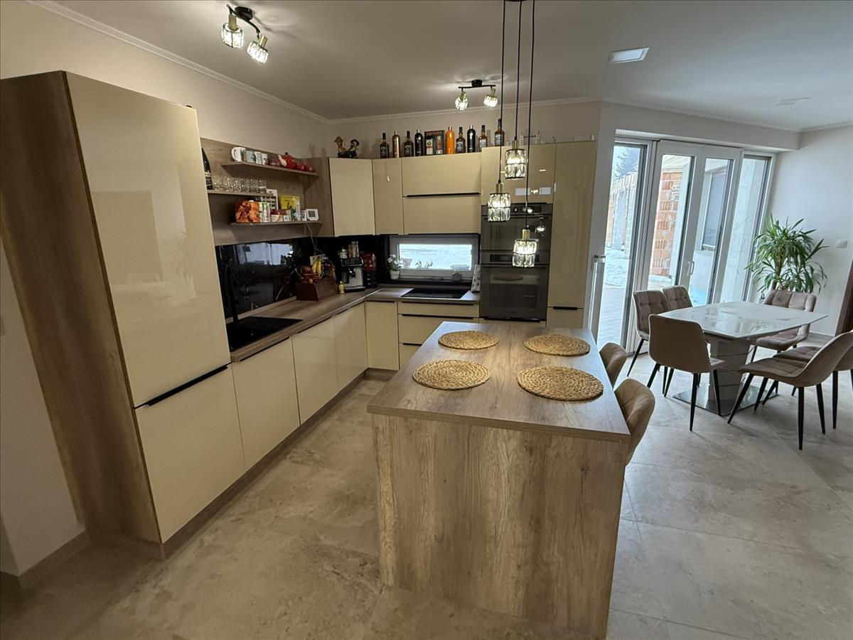 A beépített konyhabútor egyedileg gyártatott minőségi, üvegezett előlapos, soft close-s rendszerrel megépített konyhaszigettel ellátott, Whirpool beépített gépekkel szerelt.