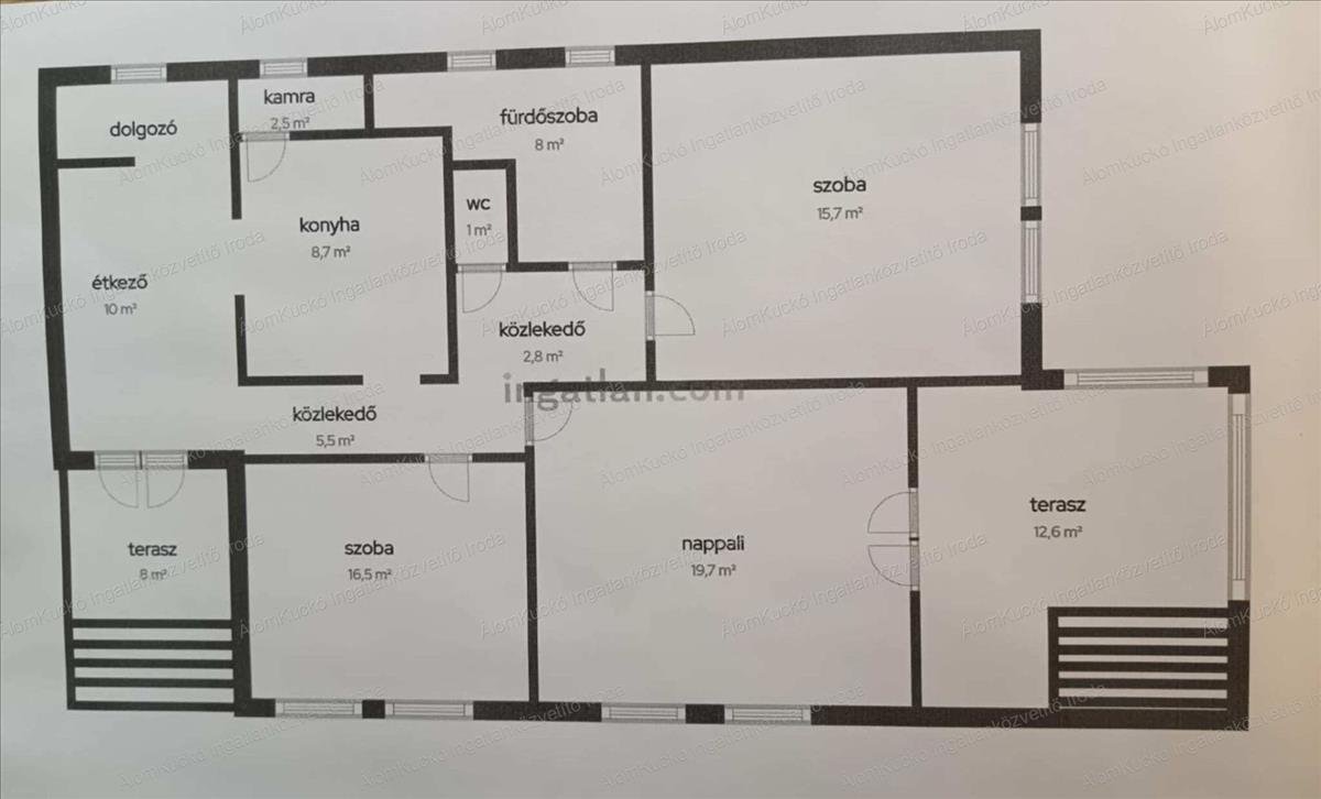 - a 103 m-es ingatlanban található 2 szoba, nappali, étkező, kamra, wc, fürdőszoba, 2 közlekedő, valamint egy üvegezett fedett terasz, mely szükség esetén, akár lakószobává átalakítható.