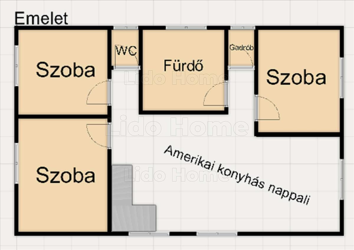 Az emeleten egy nagy, tágas amerikai konyhás nappali található, ahonnan az ablakokon keresztül gyönyörű kilátás nyílik az egész városra. Ezen kívül három hálószoba, egy fürdőszoba, valamint egy külön wc szolgálja a lakók kényelmét.