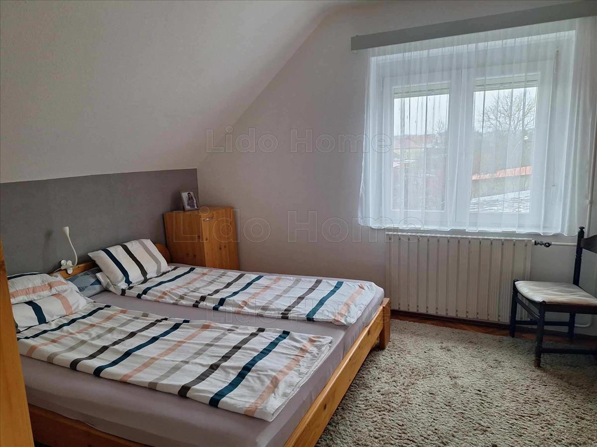Az alsó szinten a konyha mellett egy tágas nappali kapott helyet, ahol egy cserépkályha is található, ideális teret biztosítva a pihenéshez és a családi együttlétekhez. Ezen a szinten továbbá egy fürdőszoba WC-vel, valamint két külön nyíló szoba is rendelkezésre áll.