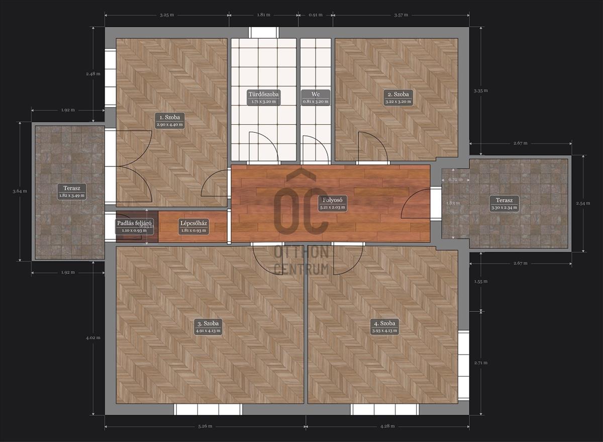 A földszint 100nm-es, nappali+3 tágas szobából, fürdőszobából és előszobából áll. a nappaliból kilépve az erkélyre csodálhatjuk a táj panorámáját.