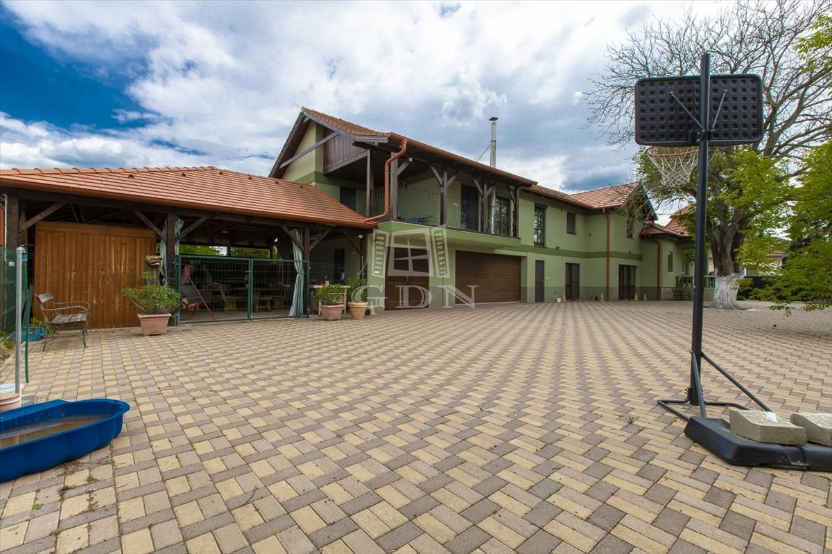 Az ingatlan megközelítése elektromos kapun történik, biztonságért riasztó illetve kamera rendszer felel.