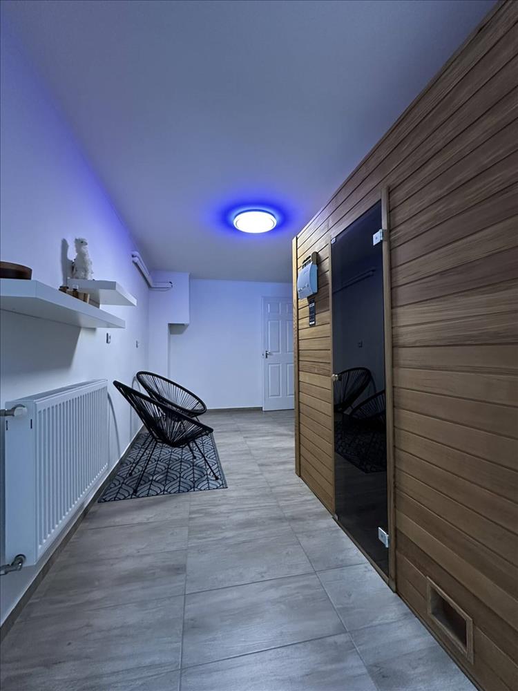Az alsó szinten, az épületen belülről és külön bejáraton keresztül is megközelíthetően került kialakításra egy önálló vendég- vagy lakrészként is tökéletesen használható helyiség, amelyhez saját fürdőszoba és külön wc tartozik. Ez a megoldás ideális többgenerációs együttéléshez, nagyobb gyermek elhelyezésére, vendégek fogadására, de akár otthoni vállalkozás, iroda vagy rendelő kialakítására is kiváló lehetőséget biztosít. Ugyanezen a szinten kapott helyet a finn és infra szauna, valamint egy tágas gardrób is, így a ház alsó része teljes értékű, kényelmes életteret kínál.