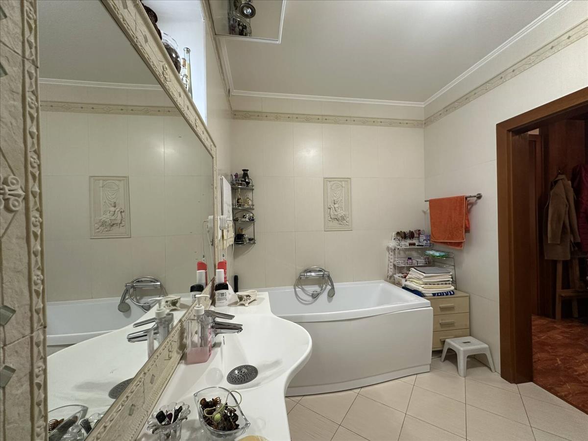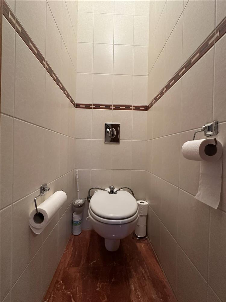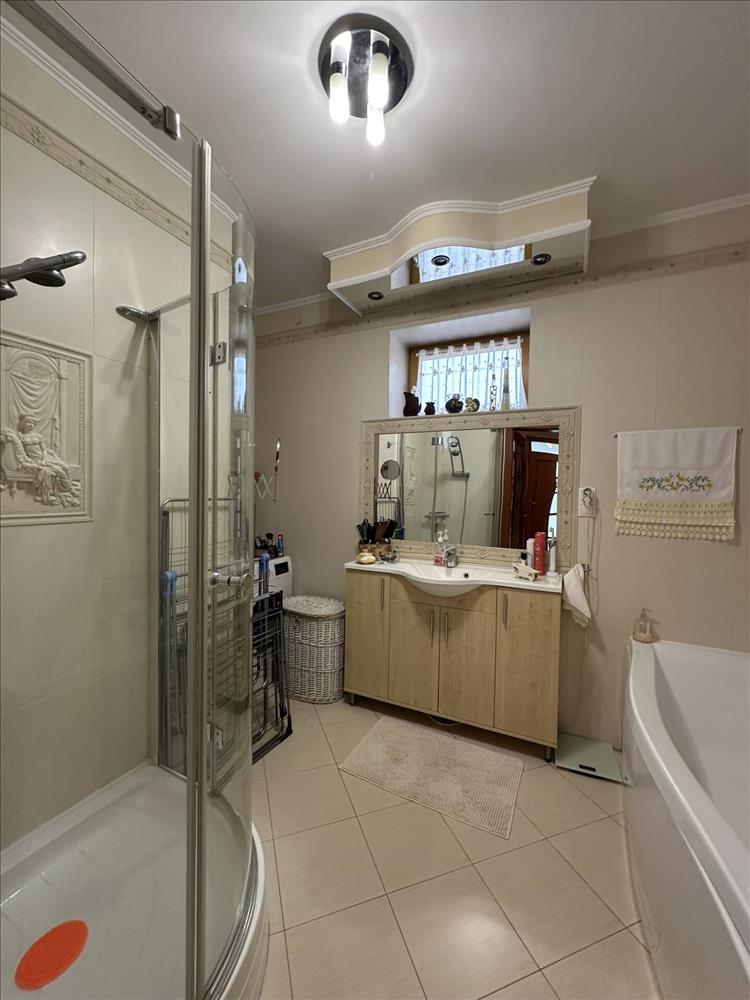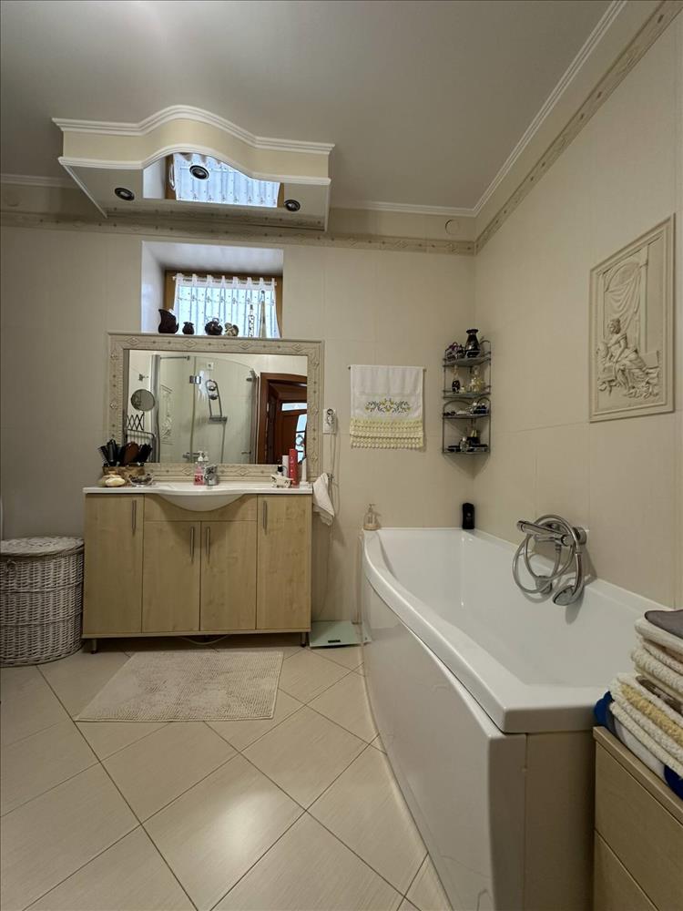 A fürdőszobában kád és épített tusoló egyaránt helyet kapott, modern, páramentes, fűthető tükörrel, ahol a funkcionalitás és