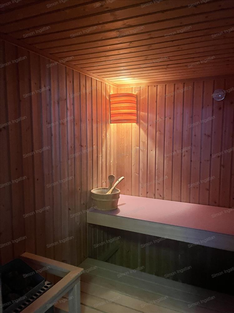 Az előszoba beépített, nagy gardrób szekrénye, a plafonba épített egyedi üveg berakás, a szauna részleg külön tusolóval, a fedett átriumos szabadidős helyiség, a nagyméretű kamra is mind-mind az eleganciát és a rendezettséget tükrözik.