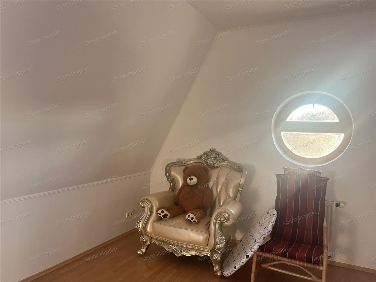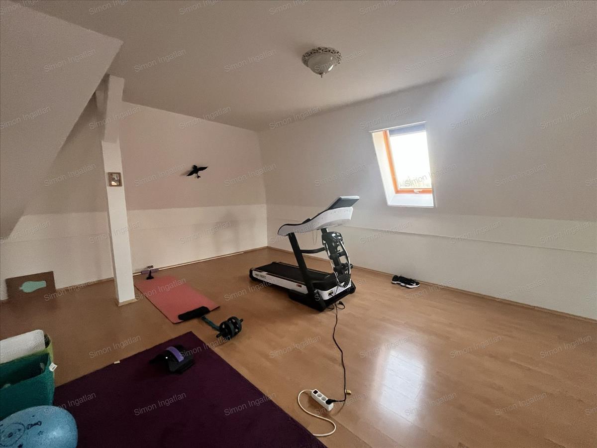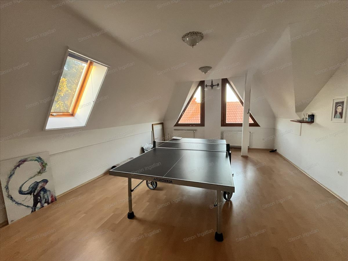 Az emeleten 4 helyiség és egy fürdőszoba található. Az egyik nagyobb szobához az emeleten is tartozik egy járható gardrób helyiség. a legnagyobb helyiség - 60 nm - jelenleg szabadidős szobaként funkcionál egy ping-pong asztallal.