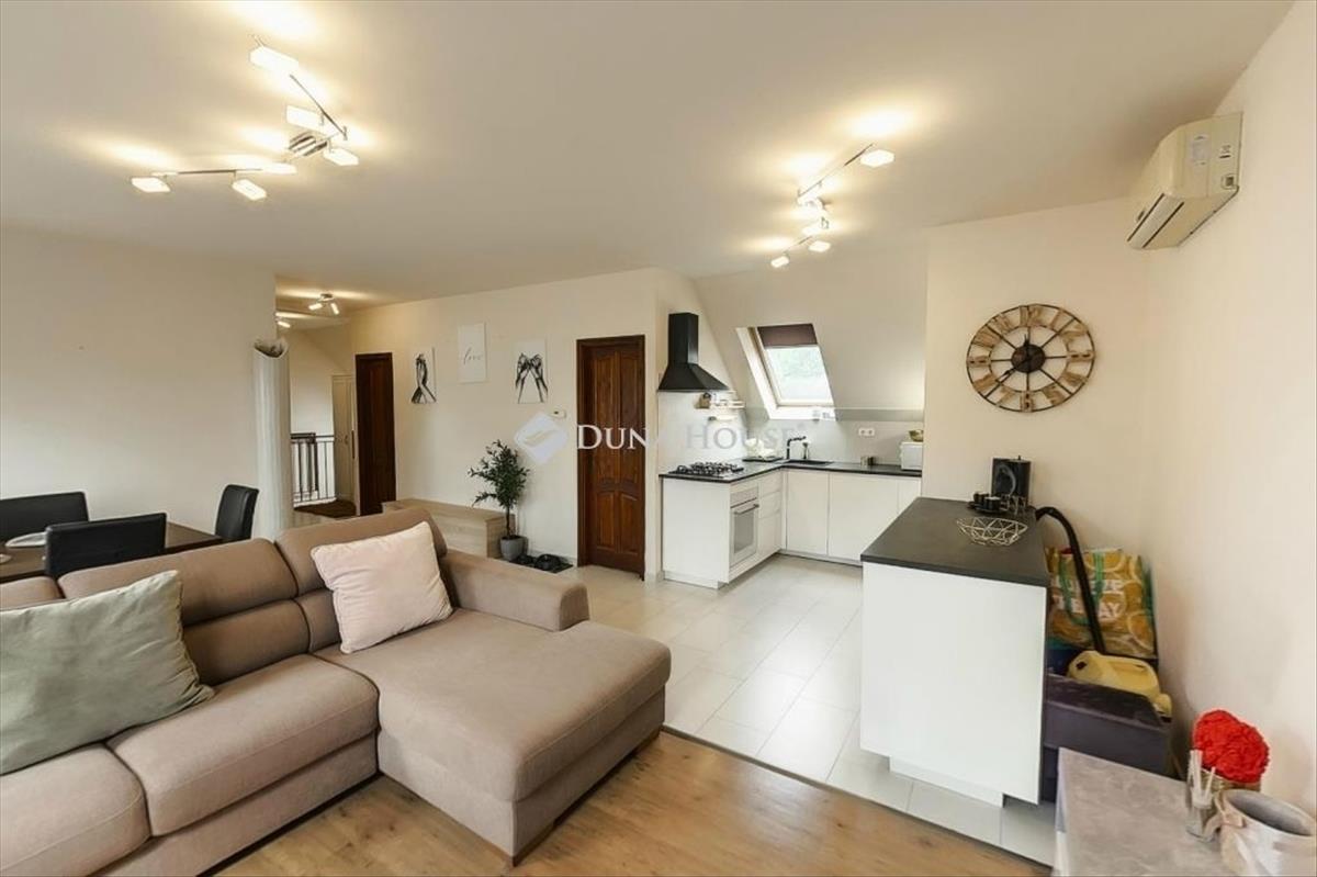A tetőtér: közel 92 nm nettó alapterületű, jól tagolt, világos terek, külön konyha és fürdőszoba, klímával felszerelve.