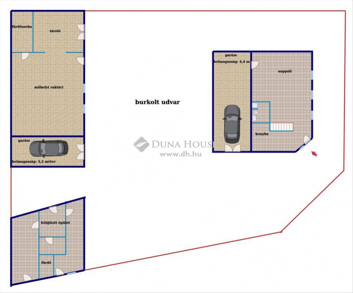 Az udvart nemes vakolattal, díszburkolattal kialakított zárt kőkerítés határolja. Két elektromos kapun lehet bejutni, az esztétikus térburkolattal ellátott telek több autó parkolására is alkalmas. Az épületekről lefolyó esővíz szakszerű elvezetéssel az utcán kialakított vízgyűjtő aknába van vezetve.